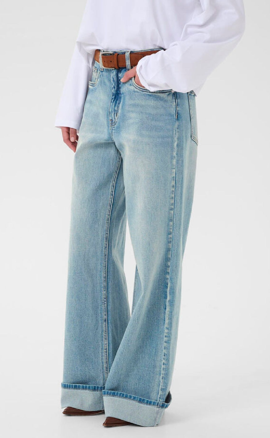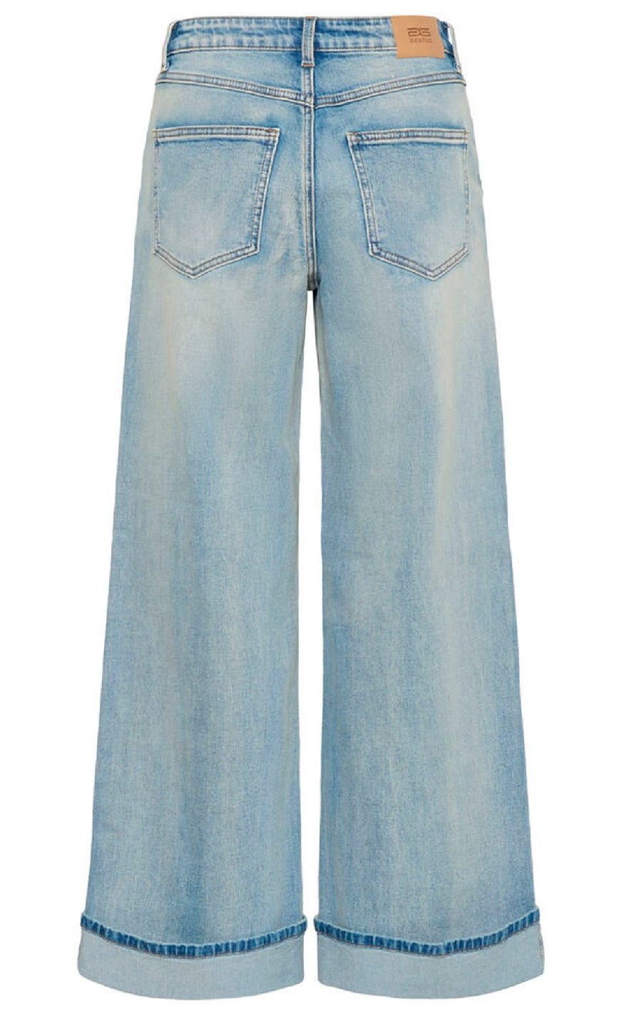 Lyseblå jeans fra Gestuz i et klassisk denimlook med bred benvidde og opsmøgede kanter.