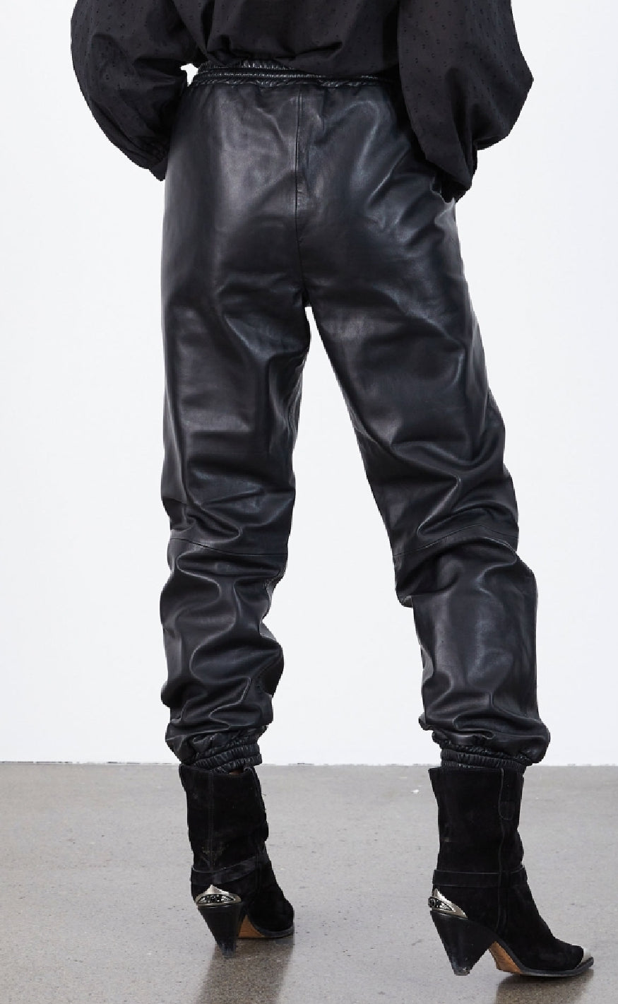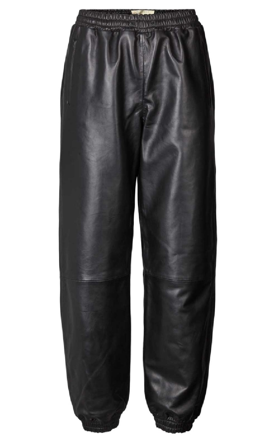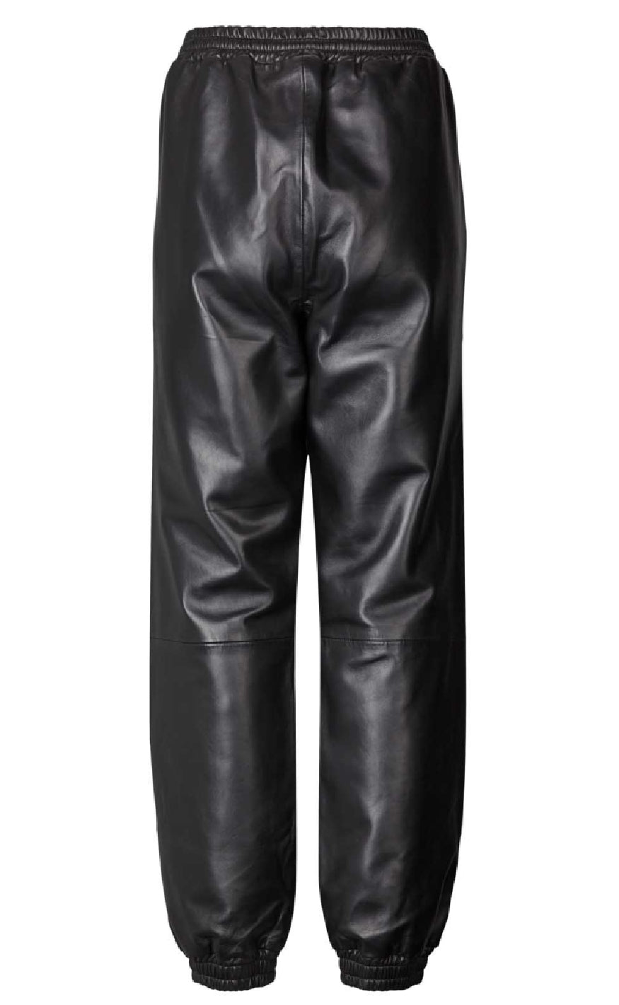 Bukser i sort læderlook med elastisk talje og afslappet pasform. Bukserne har vide ben og elastik ved anklerne for et sporty og moderne udtryk.