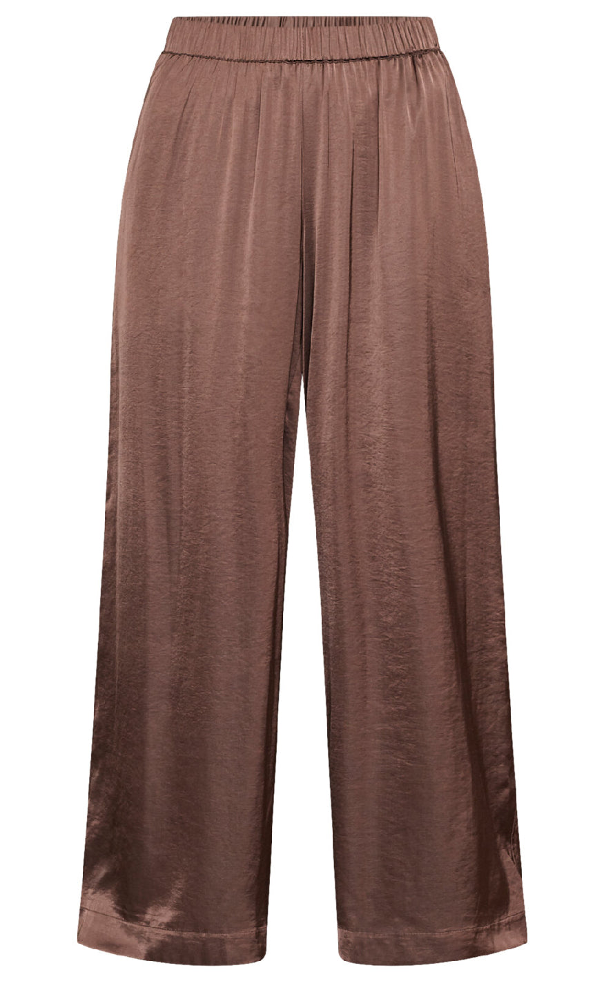 Brune bukser fra Love & Divine i glansfuld satin-look med lige ben og elastisk talje for et elegant og komfortabelt udtryk.