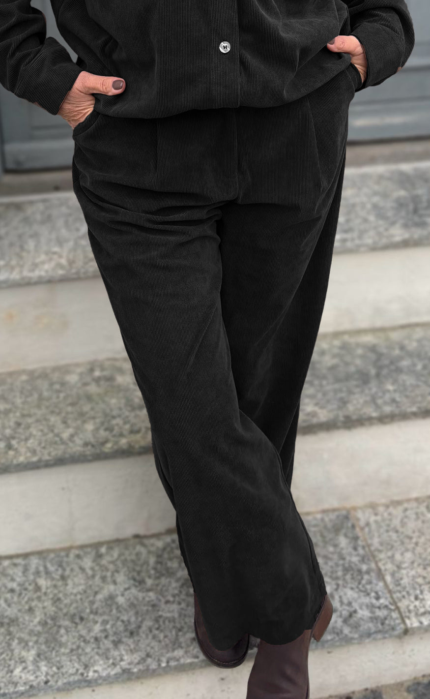 Say INA Copenhagen bukserne kan enten styles med matchende Say INA Copenhagen Skjorte - Carina - Black Corduroy eller f.eks. en ensfarvet overdel.