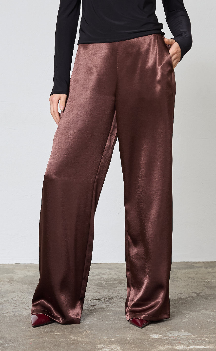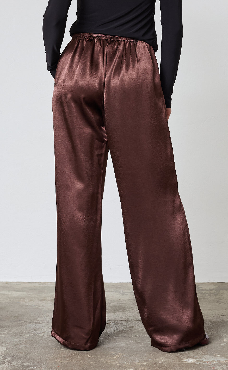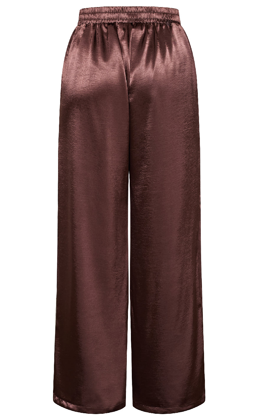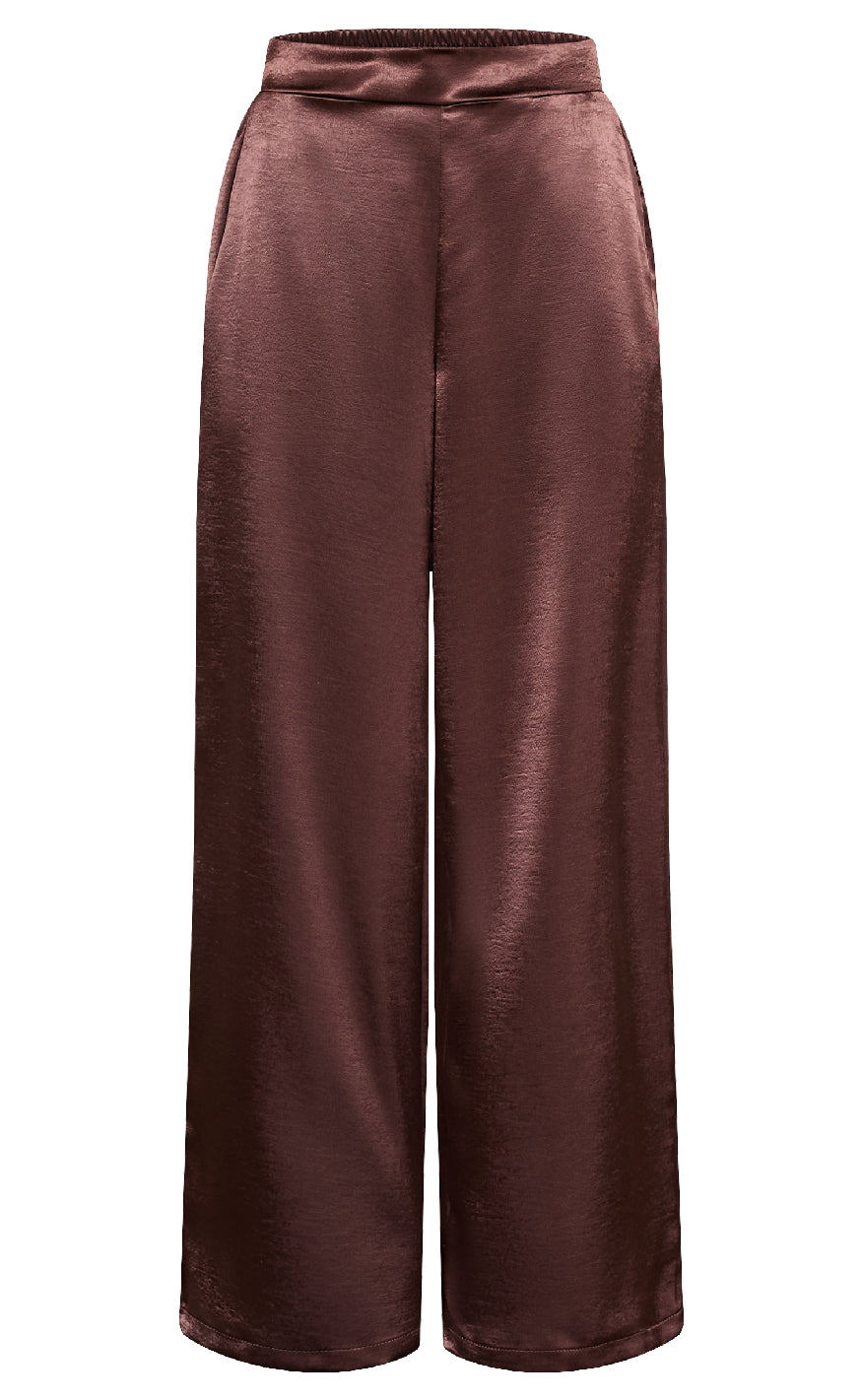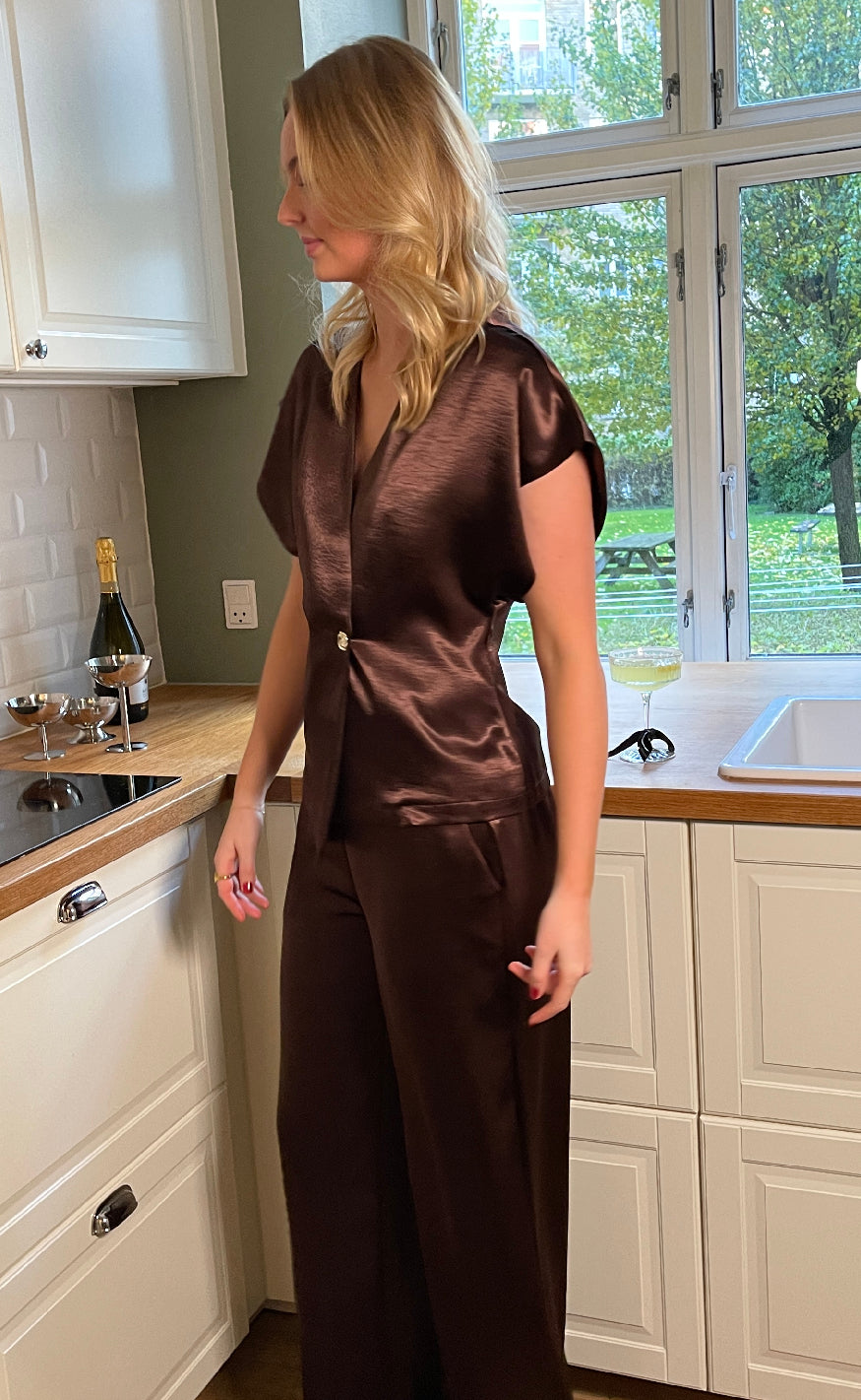 Brune satinbukser med høj talje og vide ben – et elegant og komfortabelt valg til både hverdag og fest.