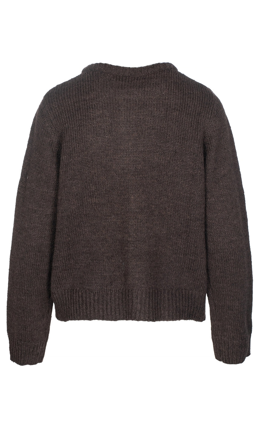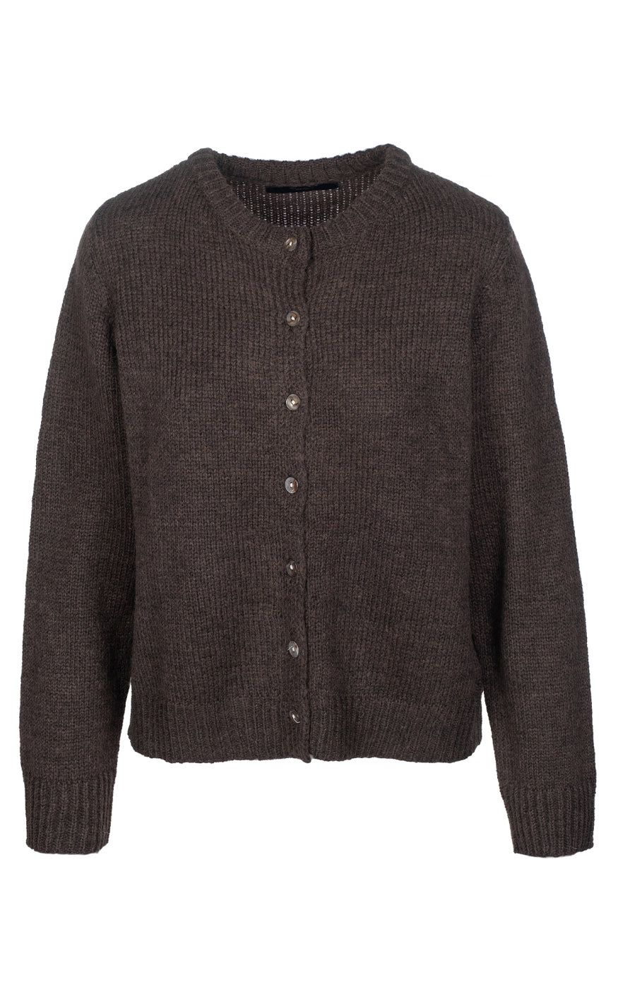 Brun cardigan fra Luxzuz med rund hals og knaplukning foran.