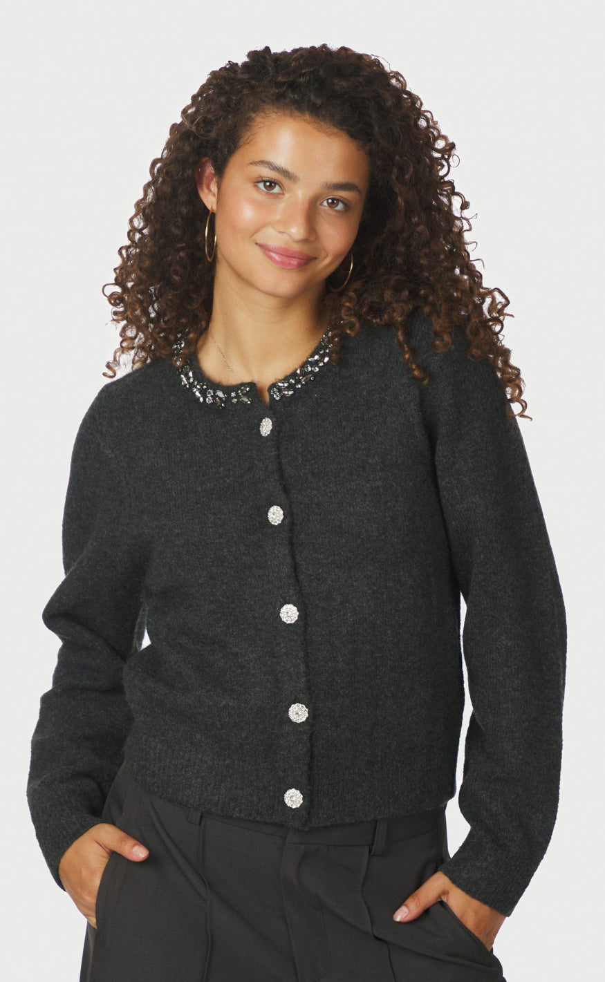 Cardiganen har rund hals med dekorative sten, lange ærmer og knaplukning med smukke knapper foran.