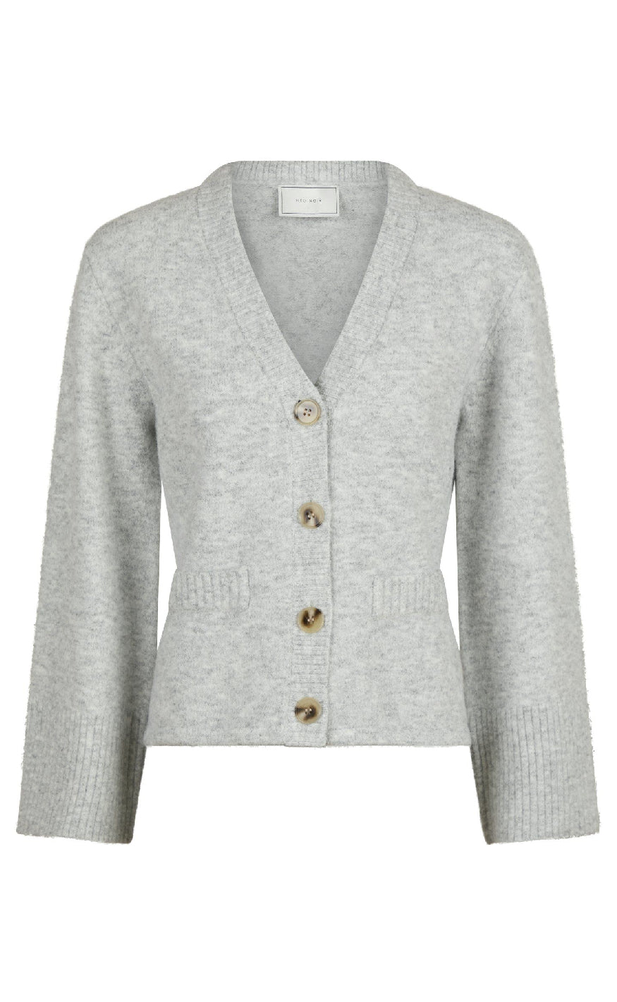 Blød, grå cardigan fra Neo Noir med V-udskæring, brede ribkanter og store knapper – en klassisk og komfortabel style til lag-på-lag look.