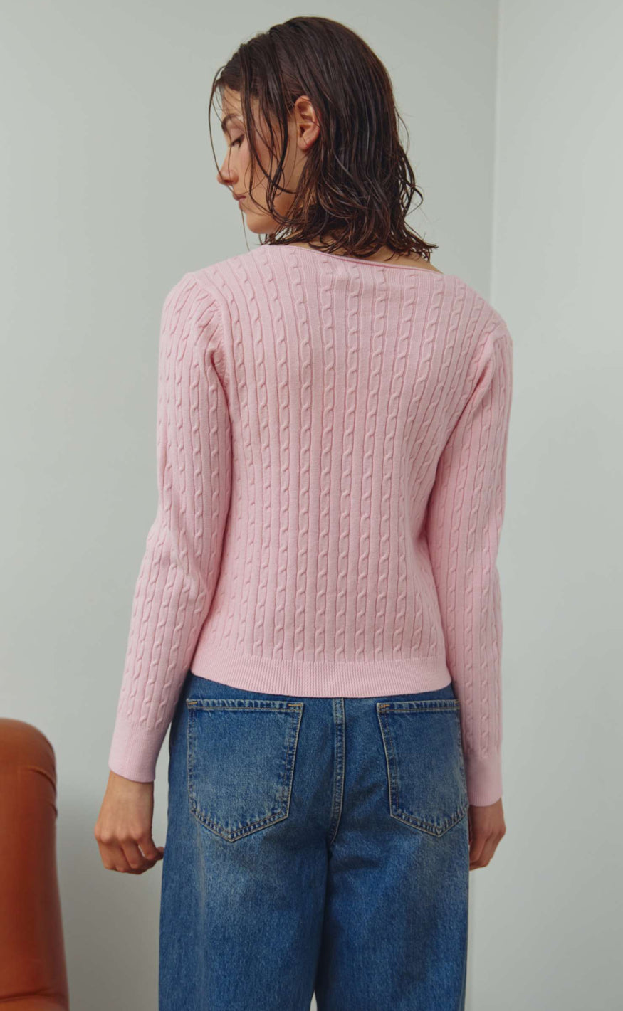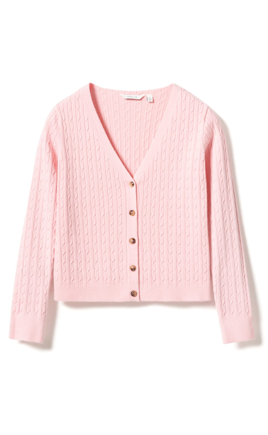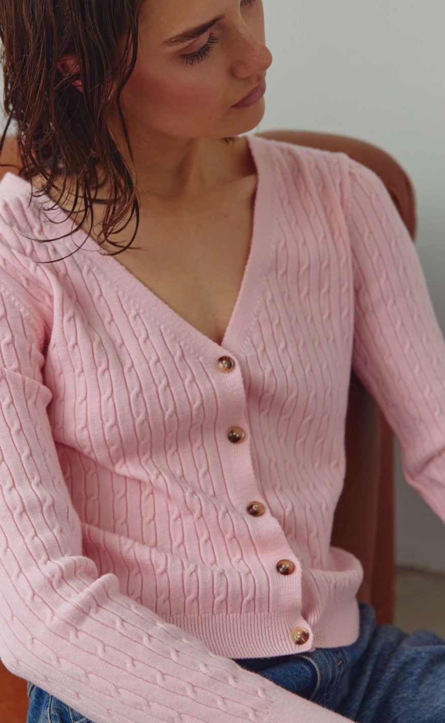 Lækker strik cardigan fra Noella i en baby pink rib kvalitet.