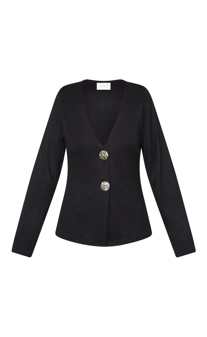 Cardigan fra Sisters Point – en blød og behagelig cardigan med brede, lange ærmer. Den har to store, dekorative knapper og en elegant v-formet åbning foran, der giver et stilfuldt og moderne udtryk.