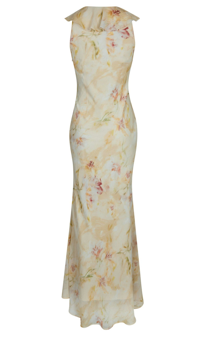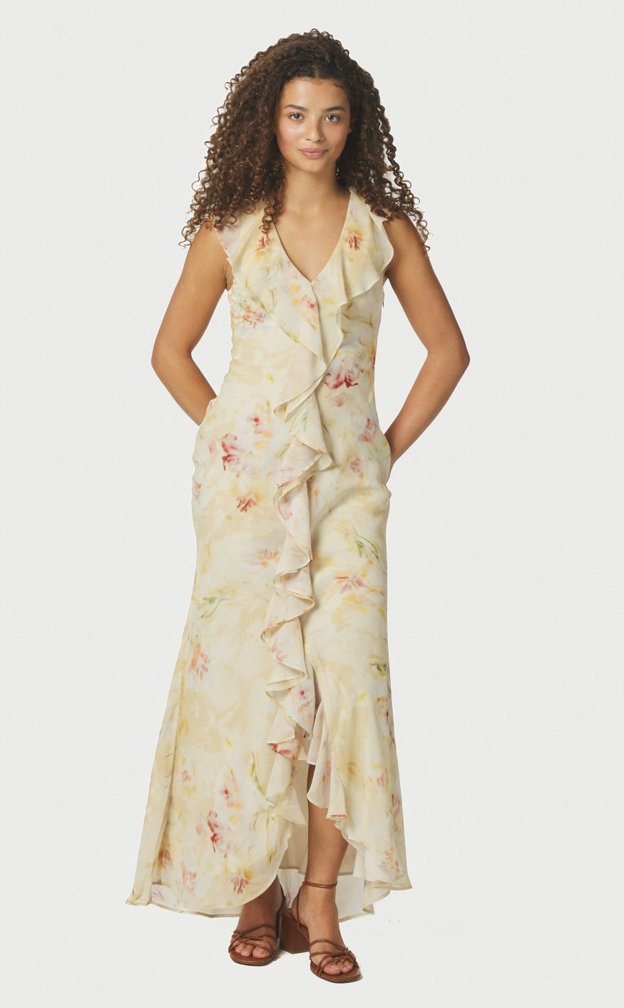Kjolen har korte flæseærmer, V‑udskæring og en elegant flæsekant ned langs fronten, som giver et let og forførende udtryk.