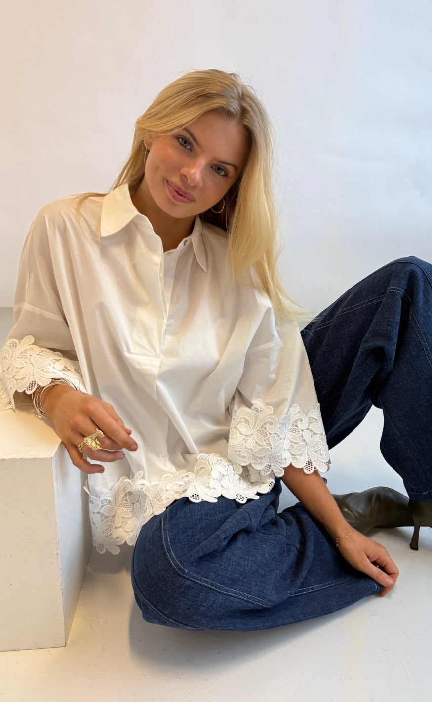 Skjorten har en løs pasform, klassisk krave og smukke blondeafslutninger ved ærmer og kant, som giver et romantisk og stilrent udtryk.