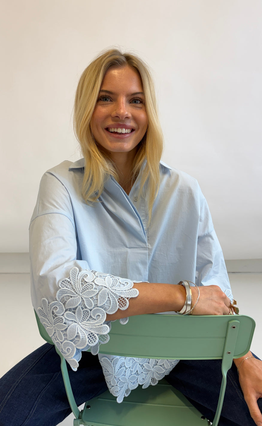 Elegant og feminin skjorte fra Culture i en klassisk lyseblå nuance med fine blondedetaljer.