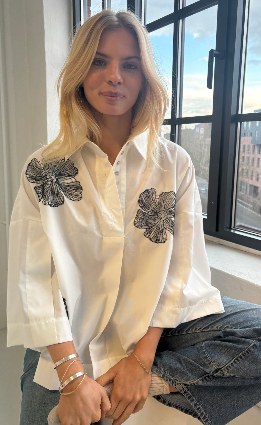Skjorten har en løs pasform, halv knaplukning, brede 3/4-ærmer og smukke broderede blomster på fronten, som giver et sofistikeret og feminint udtryk.