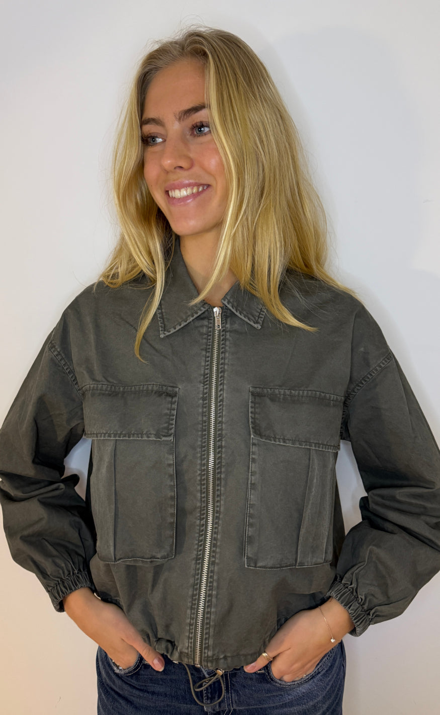 Jakken har lynlåslukning, klassisk krave, store brystlommer og elastik ved ærmer og bund, som giver et afslappet og moderne udtryk med et let råt twist.