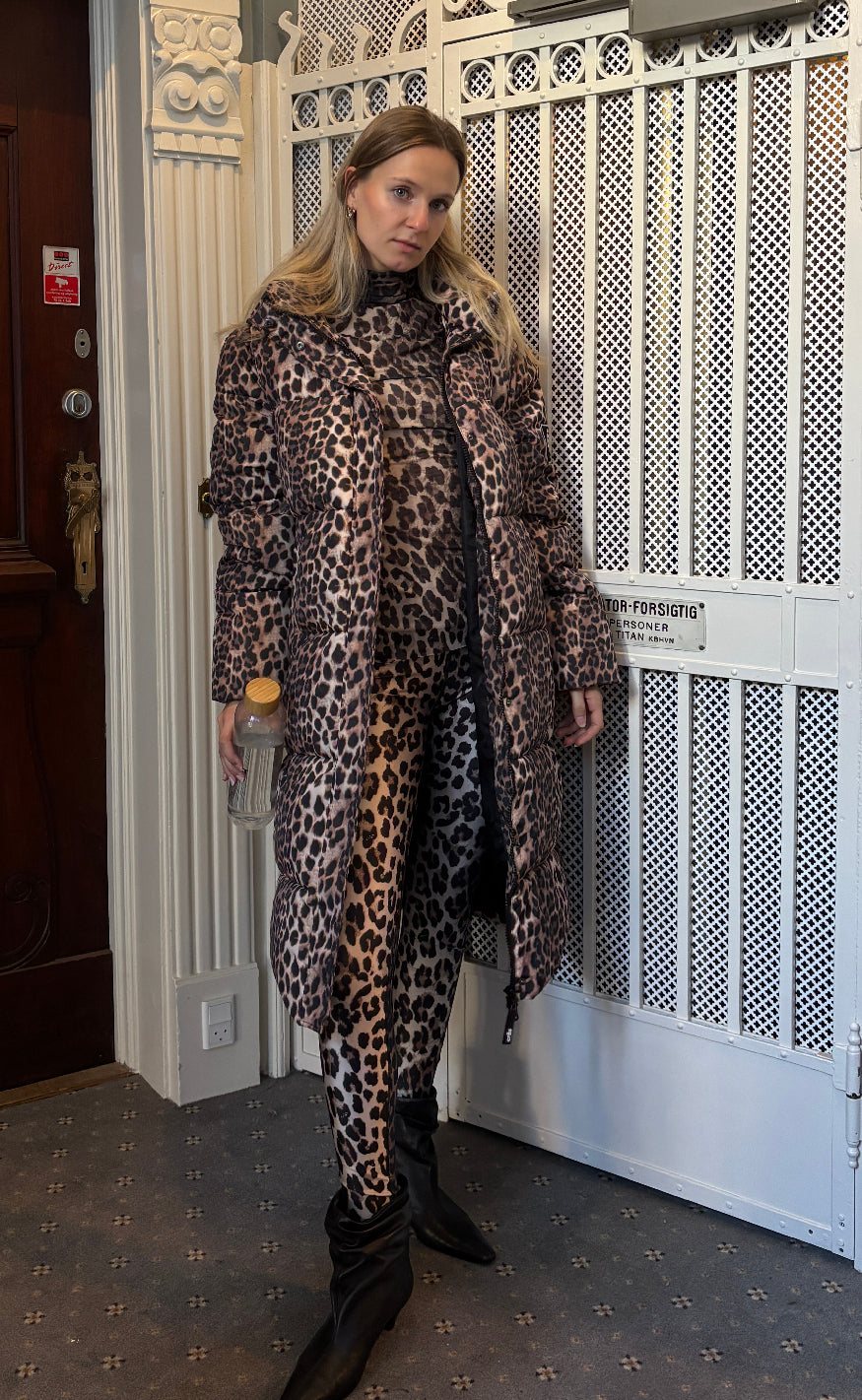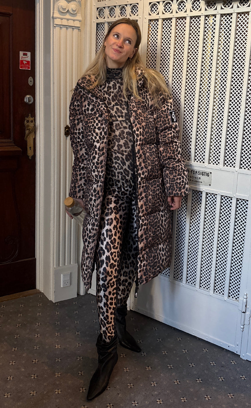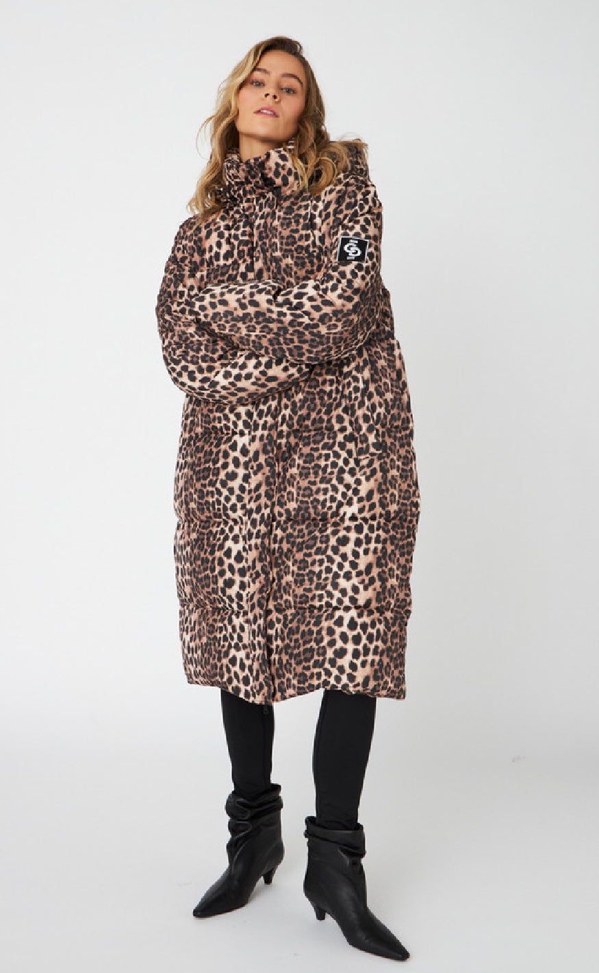 Lang dynejakke i leopardprint. Jakken har lynlås foran, 2 lommer og en hætte. Denne trendy jakke holder dig varm hele vinteren