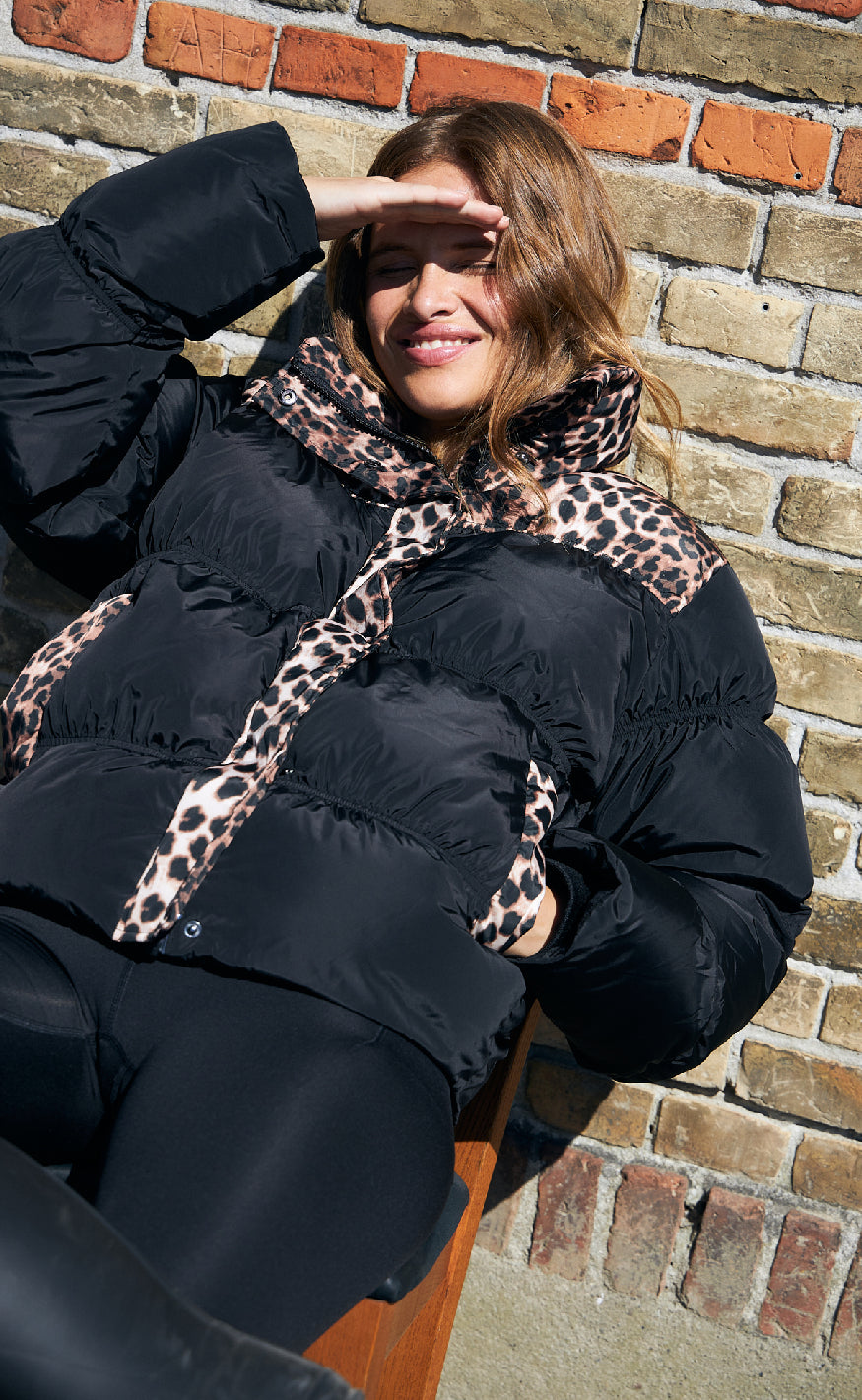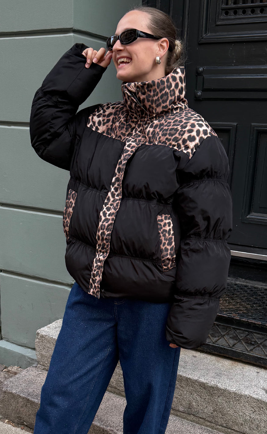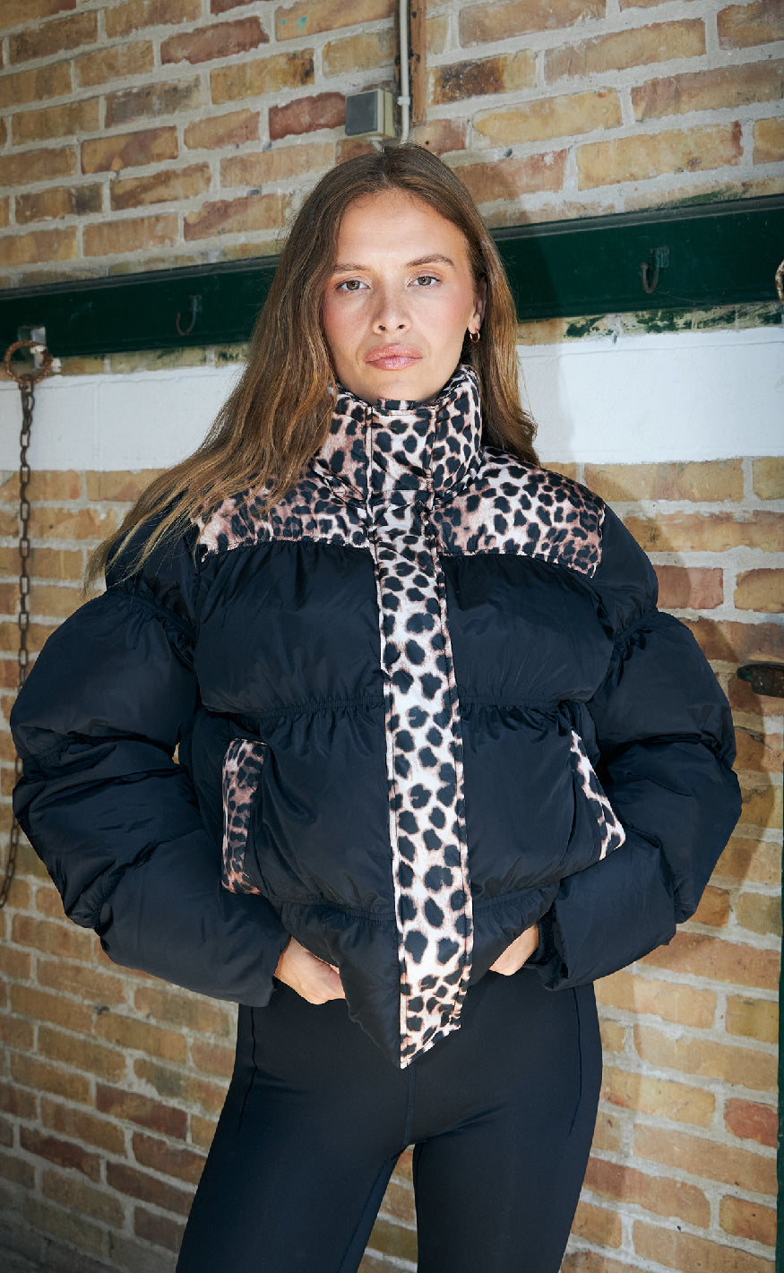 Dejlig varm puffer jakke fra Cras i sort med leoparddetaljer.