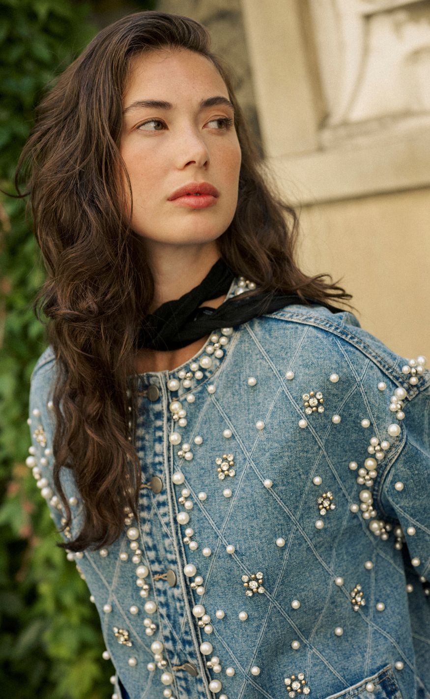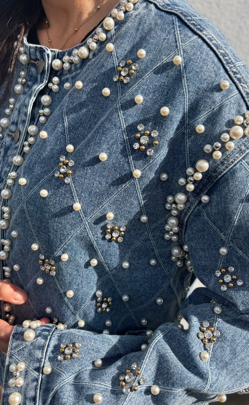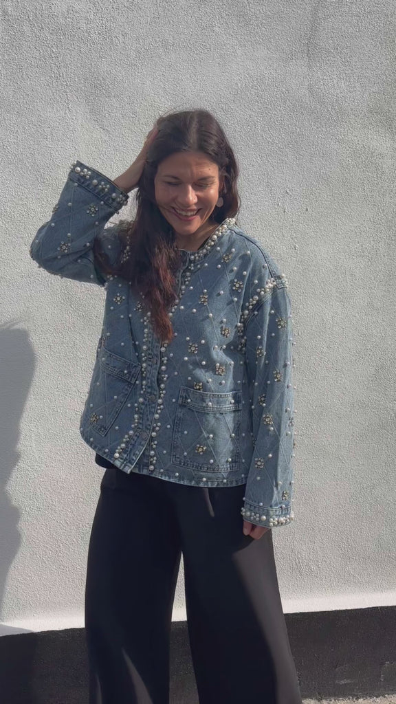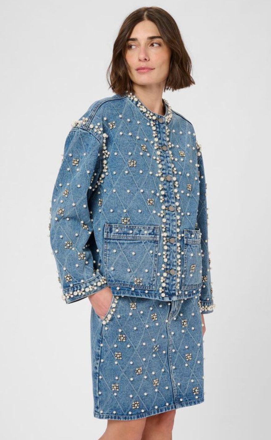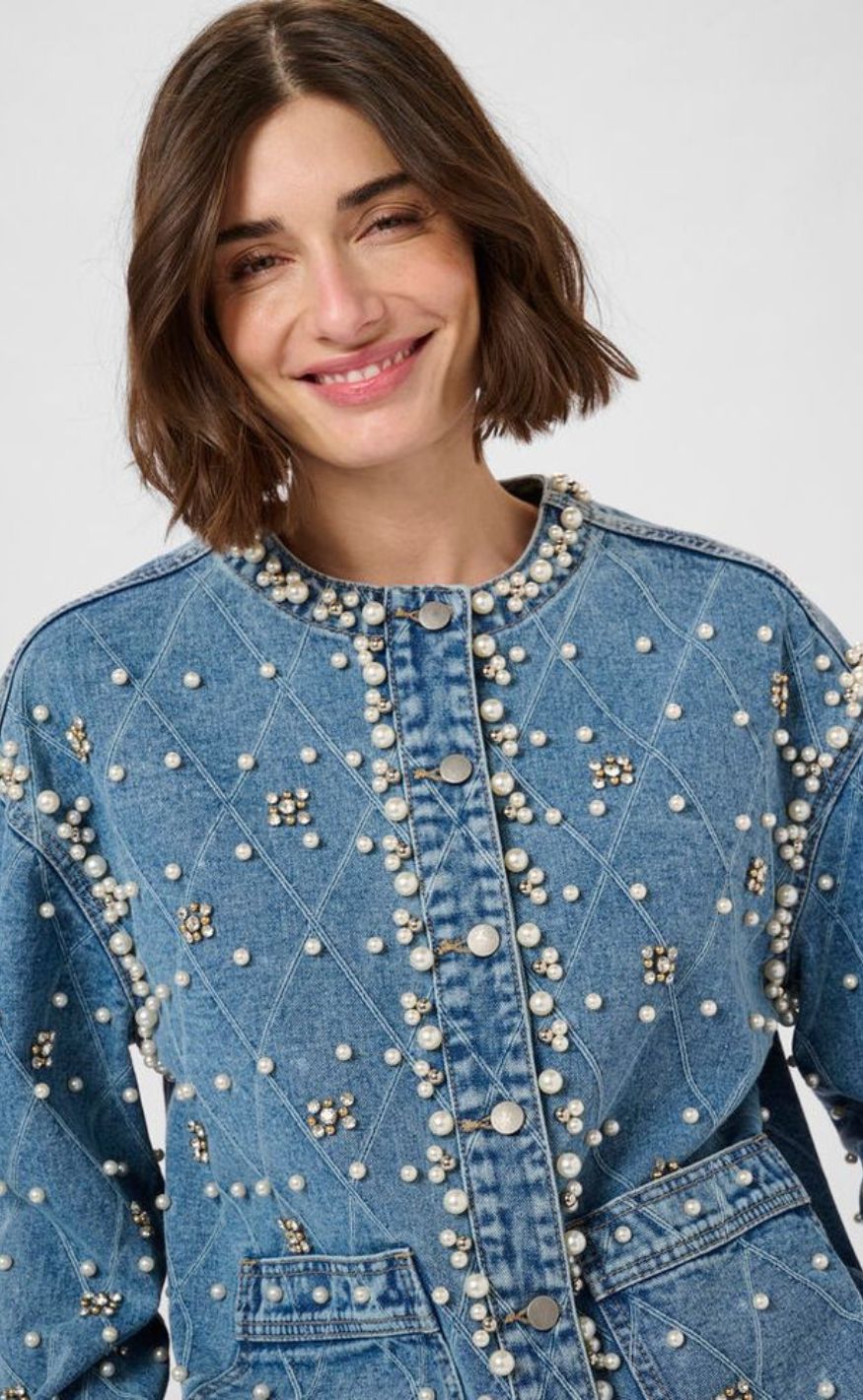 Smukkeste denim jakke fra mærket Culture med smukke perledetaljer og lommer