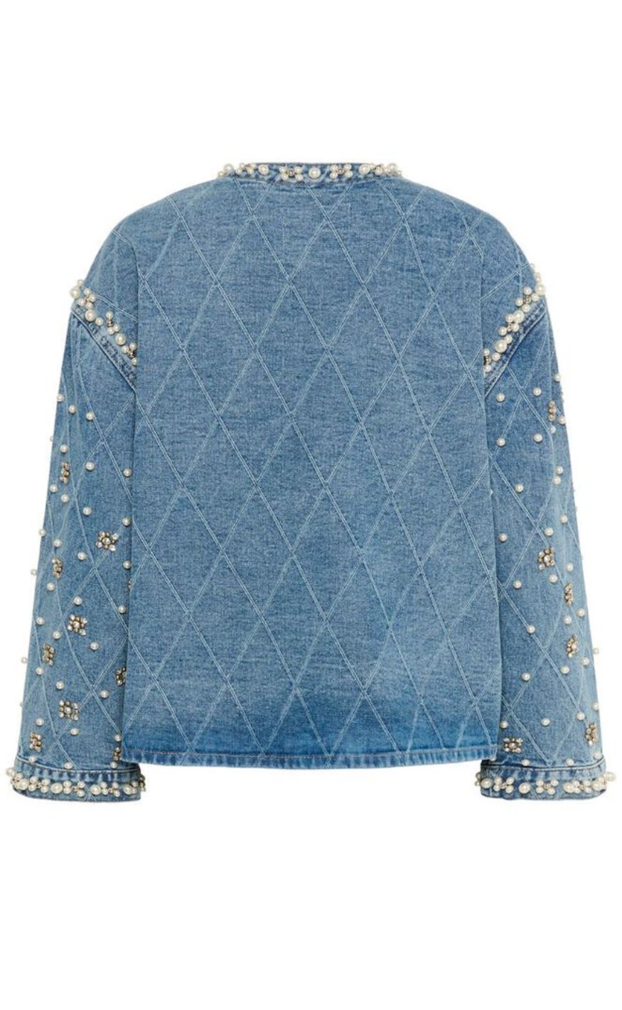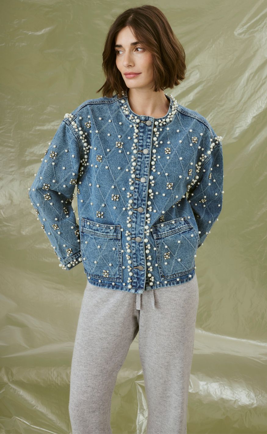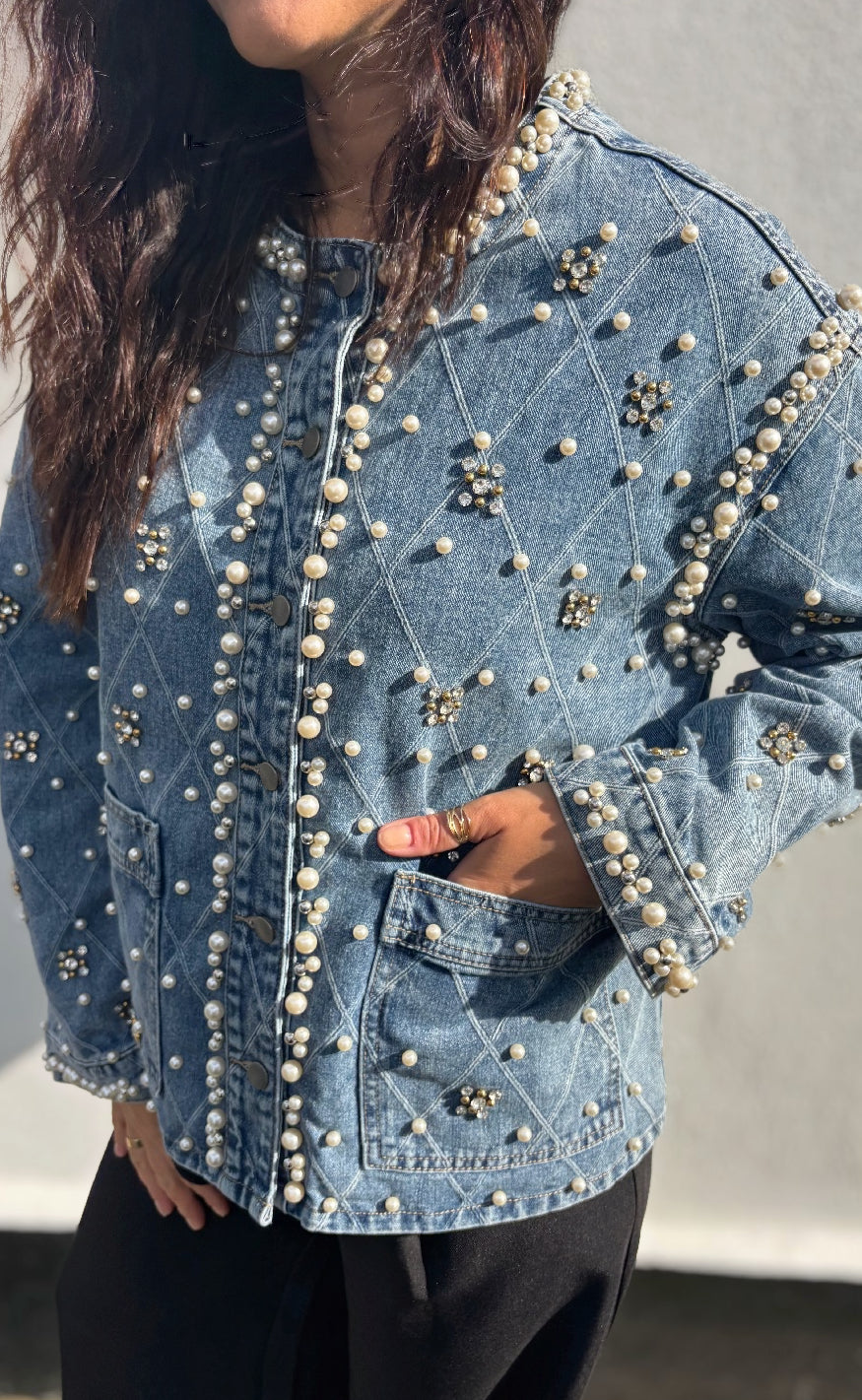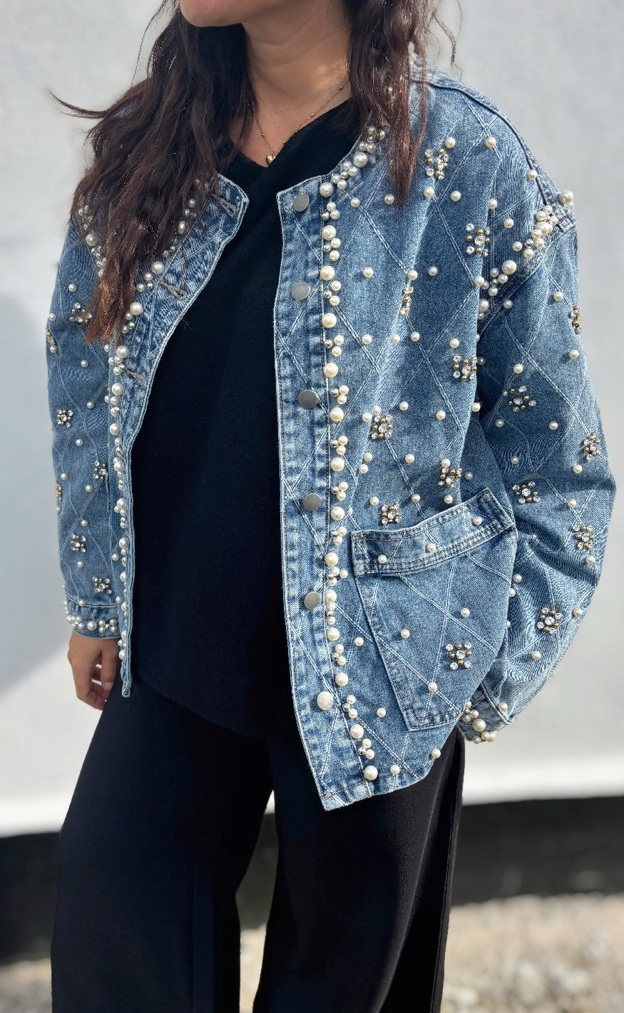Smukkeste denim jakke fra mærket Culture med smukke perledetaljer og lommer