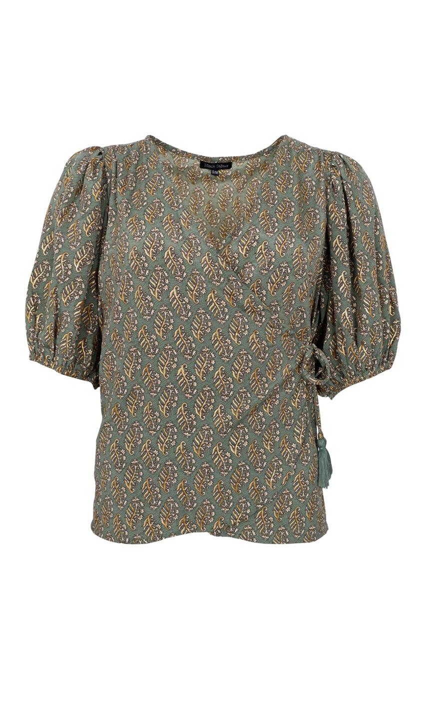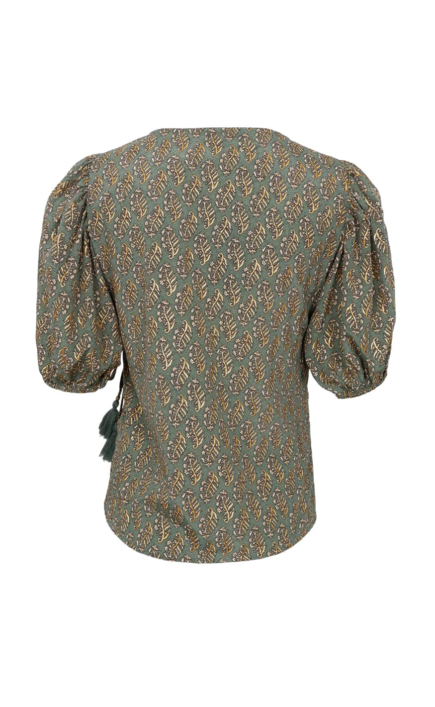Blusen har korte, puffede ærmer, en blød V‑udskæring og et slå‑om‑look med bindebånd i siden, der giver en flatterende pasform og et elegant, let udtryk — perfekt til både hverdag og pænere anledninger.