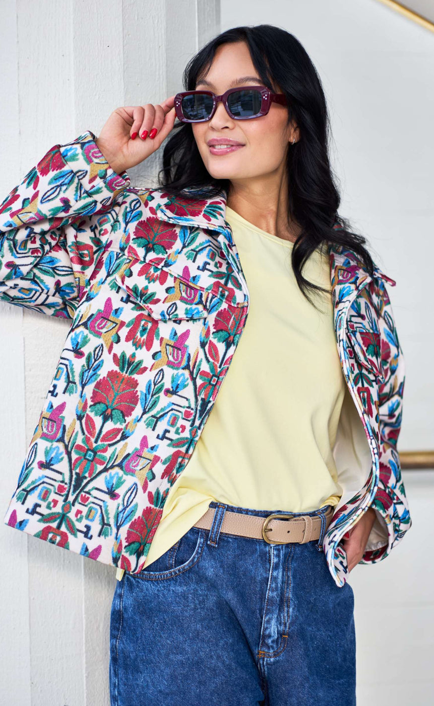 Farverig og stilfuld jakke fra Black Colour med et unikt, multifarvet blomsterprint, der giver et fint udtryk.