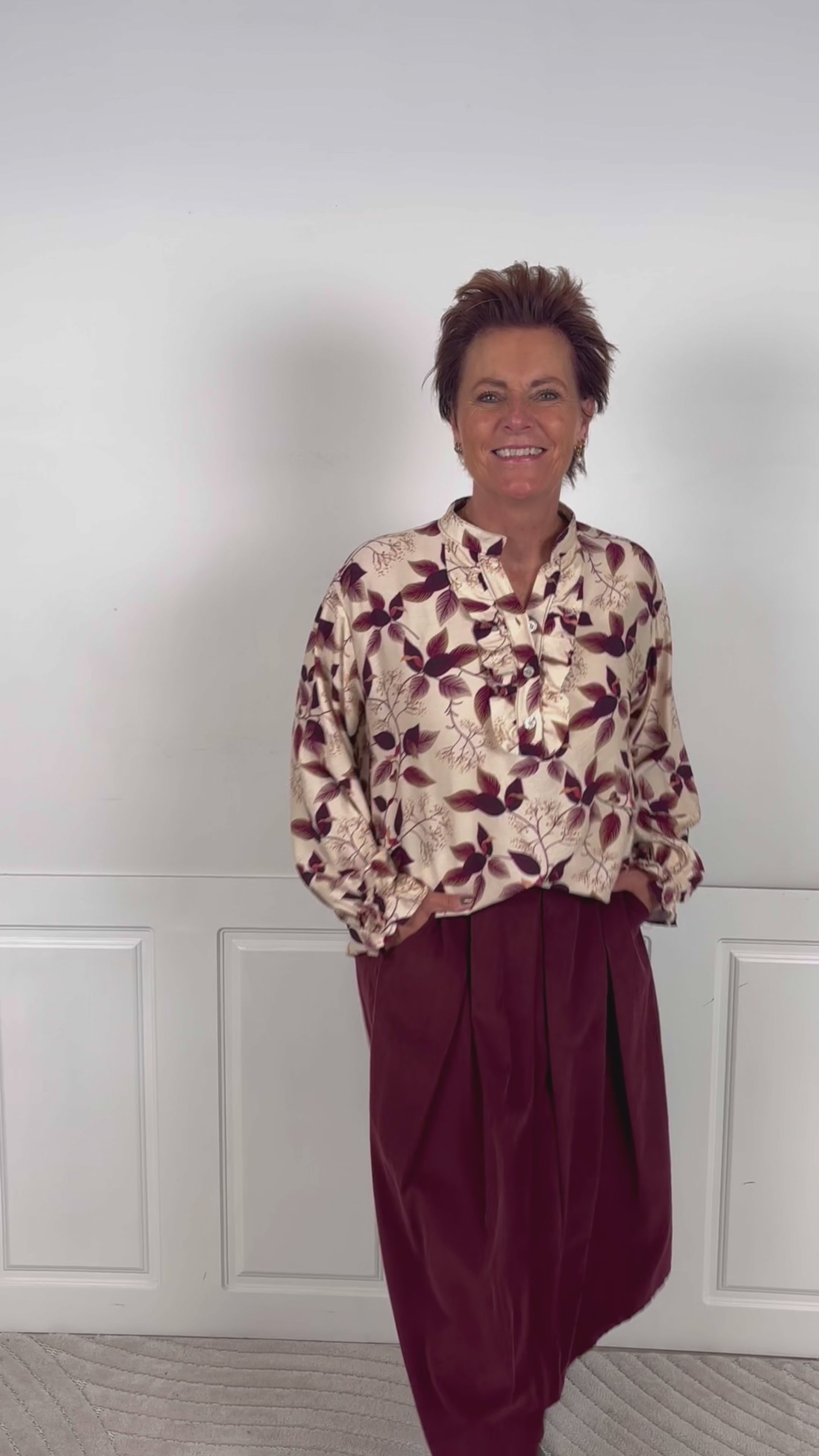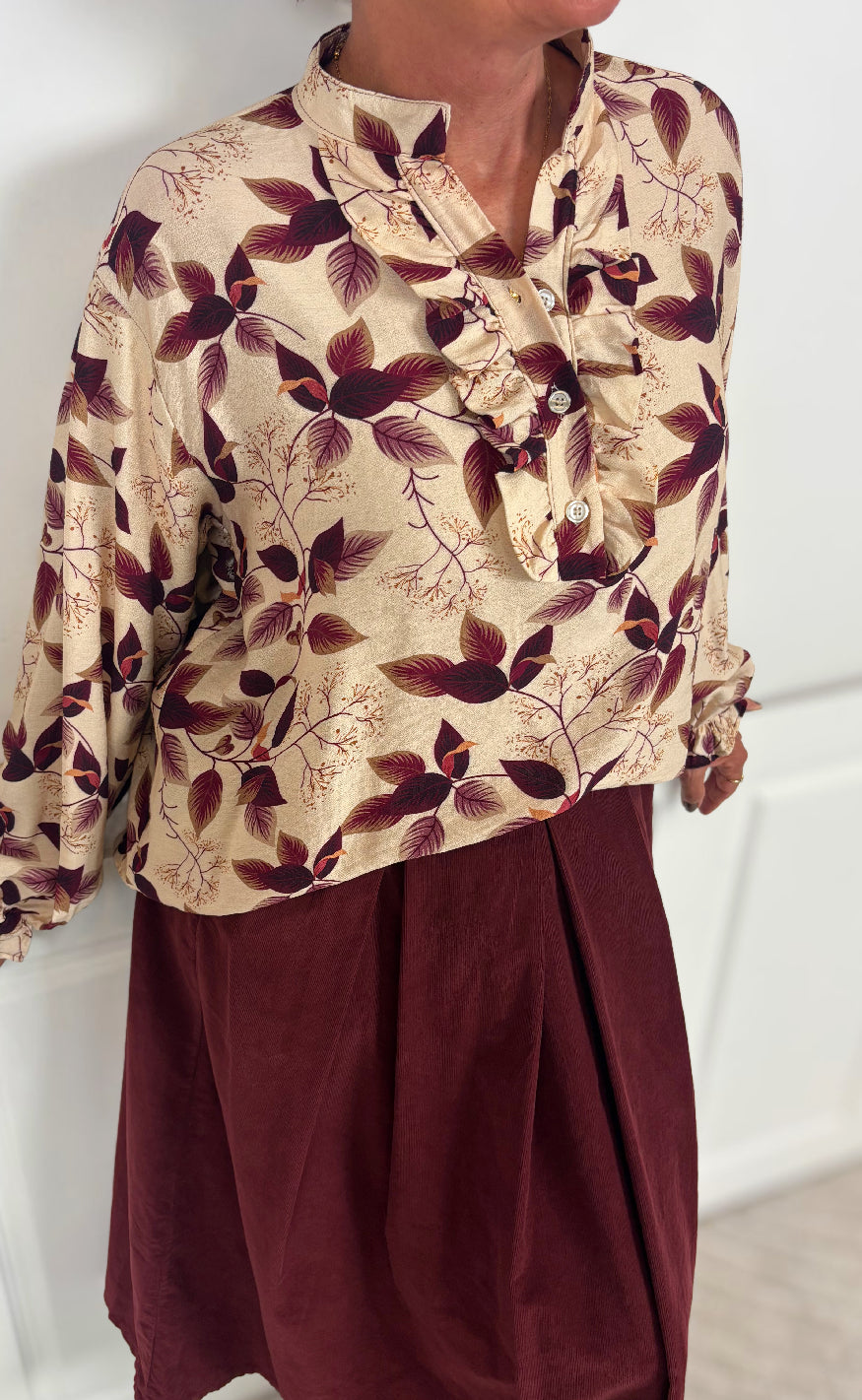 Fin skjortebluse fra Marta Du Chateau i brun, med et sødt print forneden.