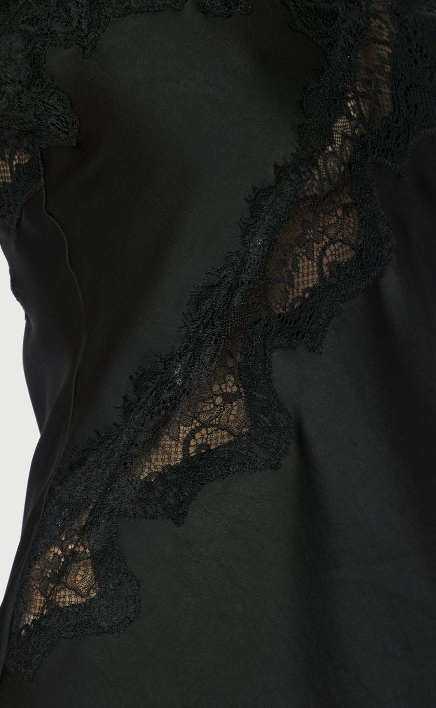 Flot feminin kjole i sort fra Neo Noir med blonde detaljer i assymetrisk pasform. Kjolen kommer i en fin satin kvalitet.