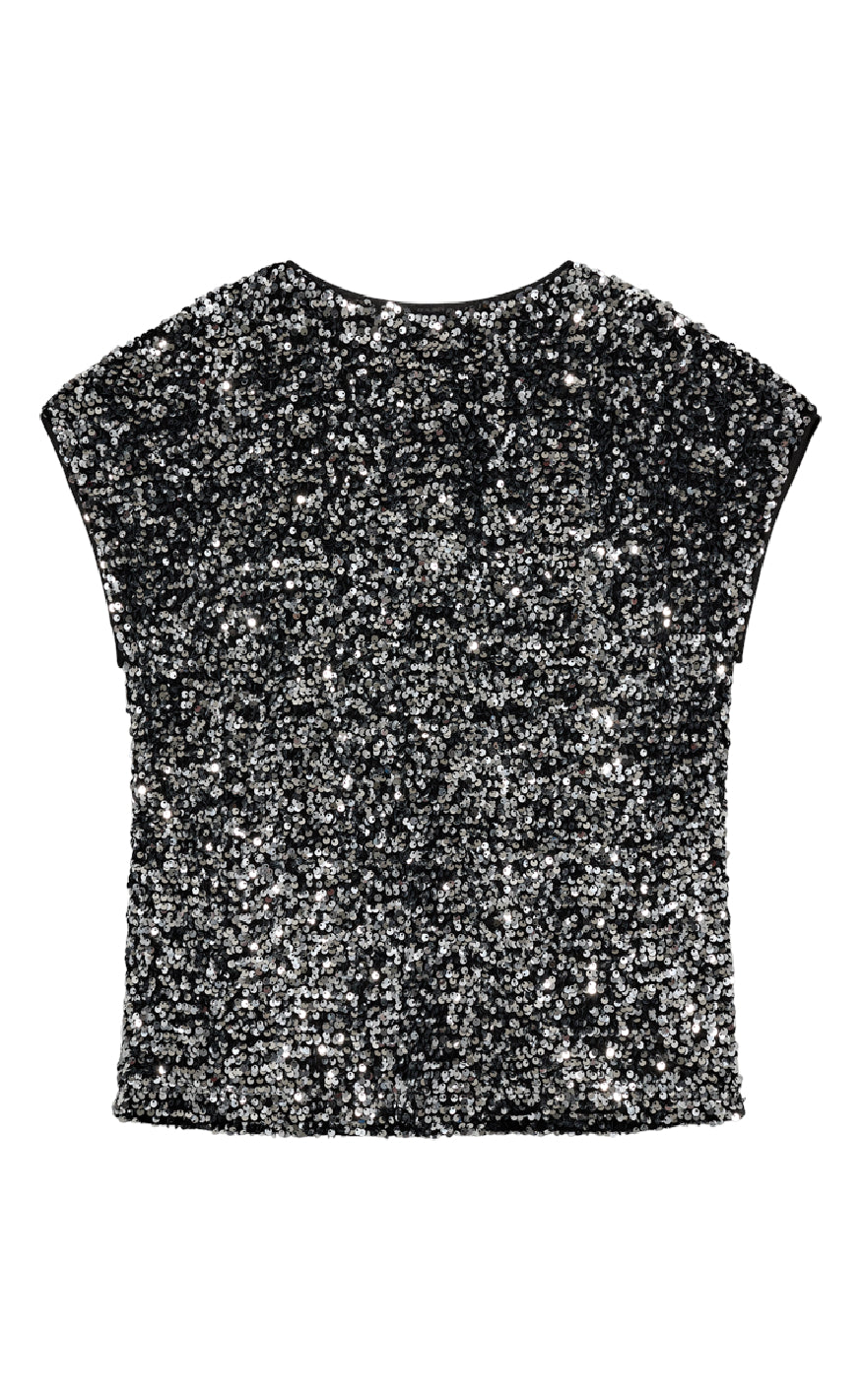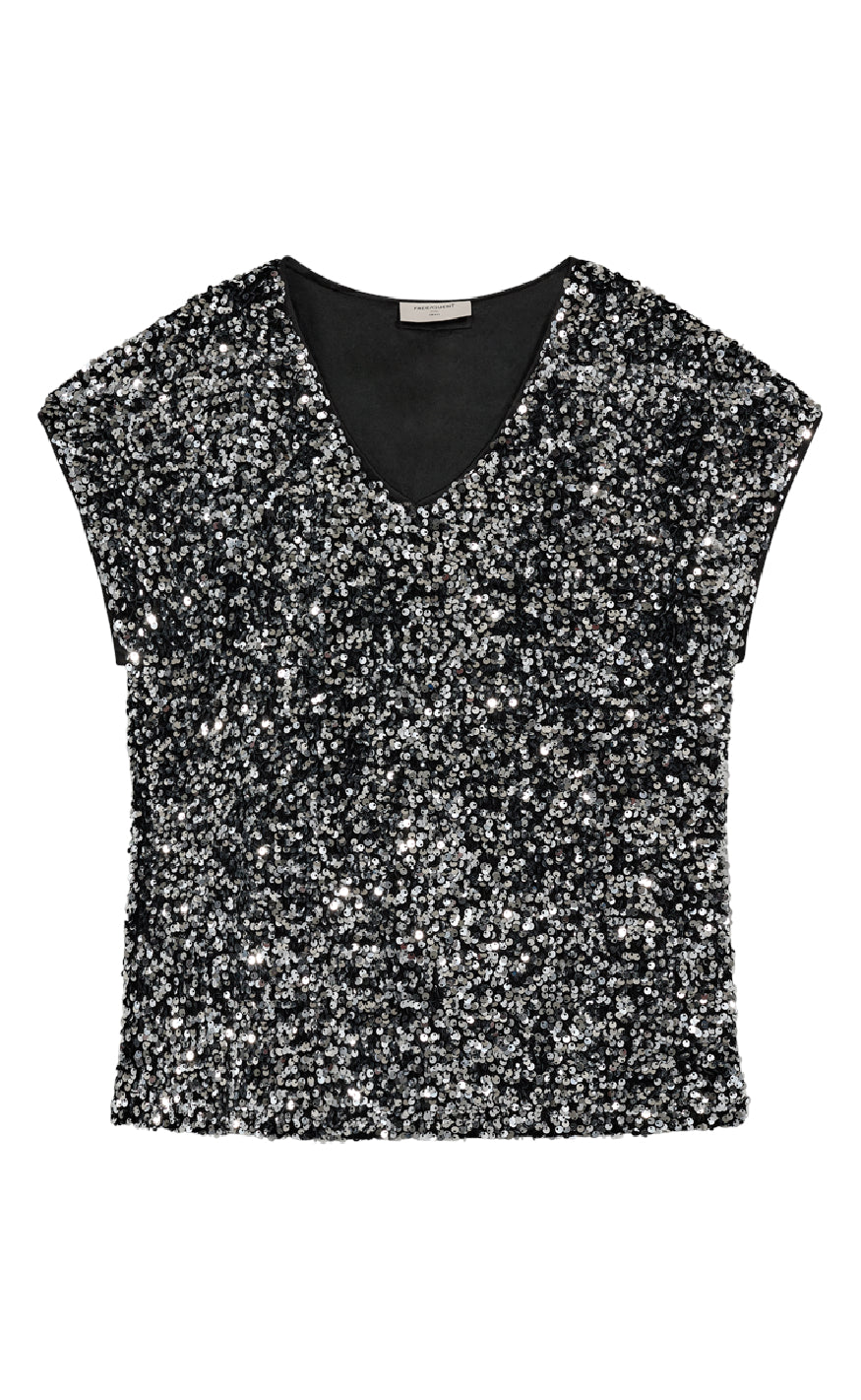 Sort paillettop fra Freequent med V-udskæring og korte ærmer – ideel til et glamourøst og festligt look.