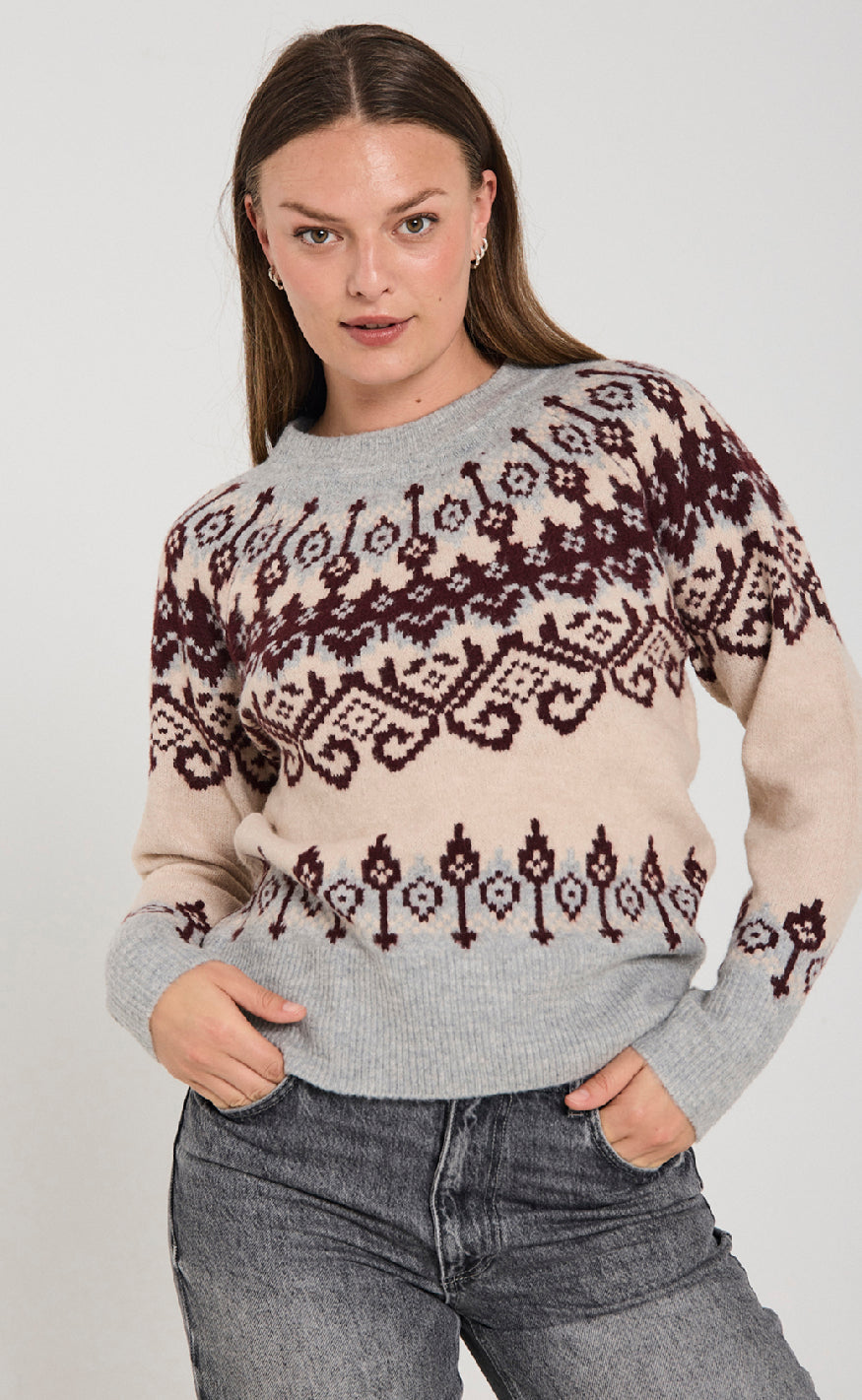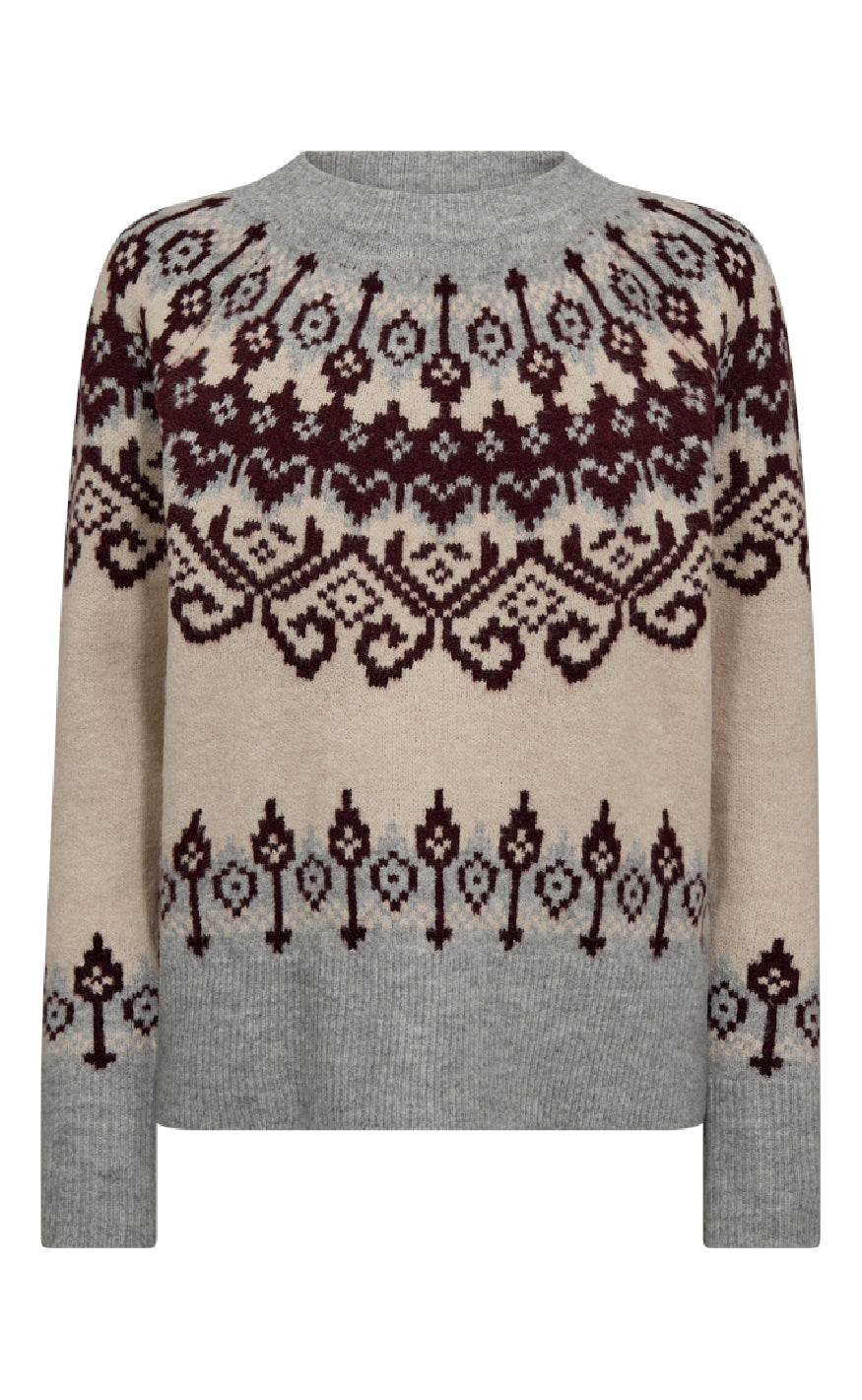 En strikket sweater fra Freeuqent i grå og beige med mønster i bordeaux og gråtoner.