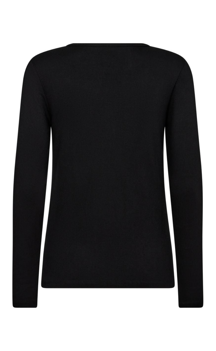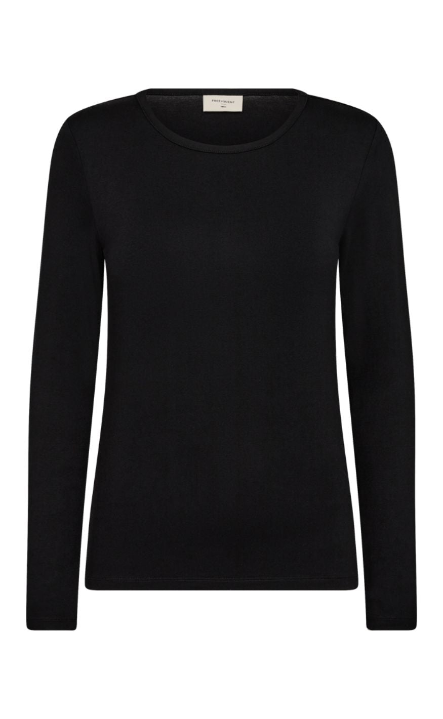 Bluse i sort fra Freequent i blødt jerseymateriale. Blusen har rund halsudskæring, lange ærmer og en elegant, tætsiddende pasform.