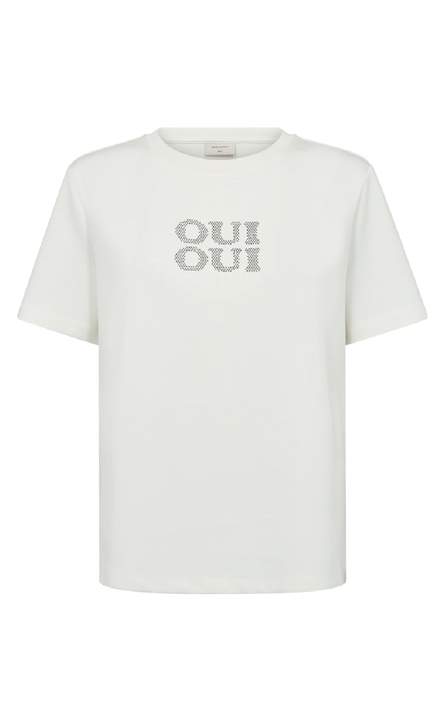 Hvid T-shirt fra Freequent med rund hals og kort ærme, dekoreret med “OUI OUI” print i små sten for et stilrent og feminint look.