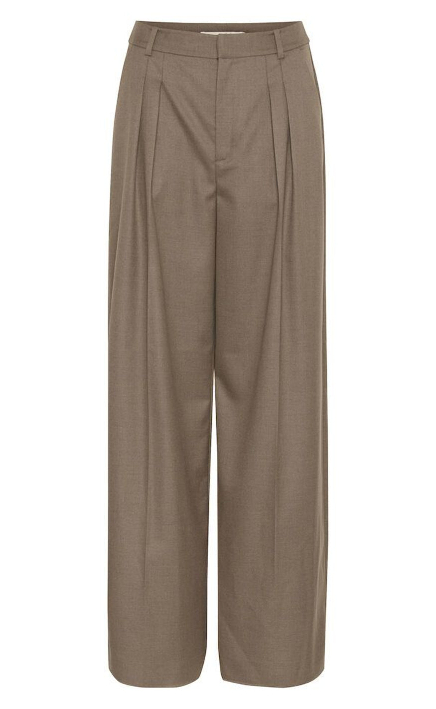 Bukserne har en høj talje, vid pasform og fine læg foran, som giver et klassisk og stilrent udtryk.