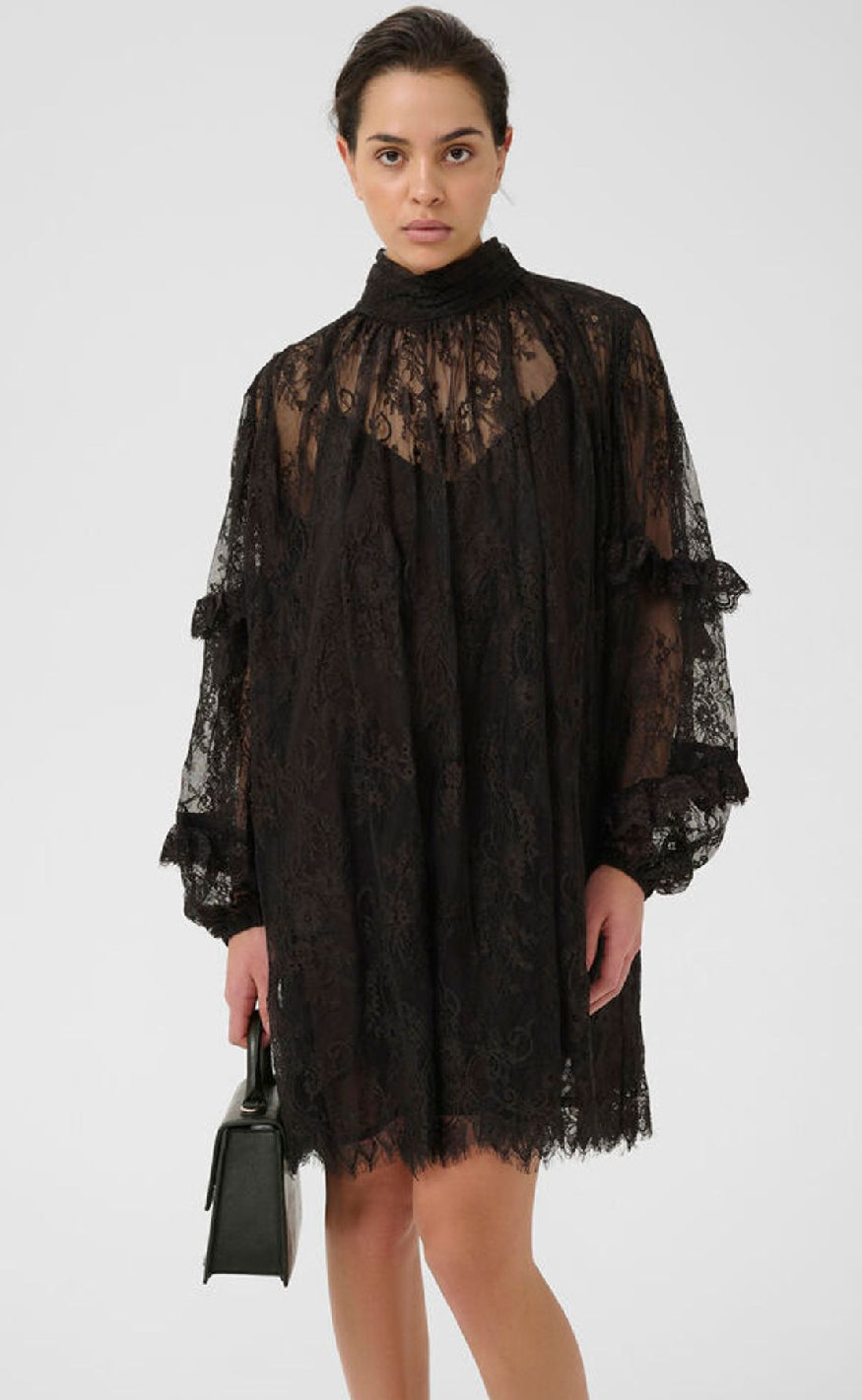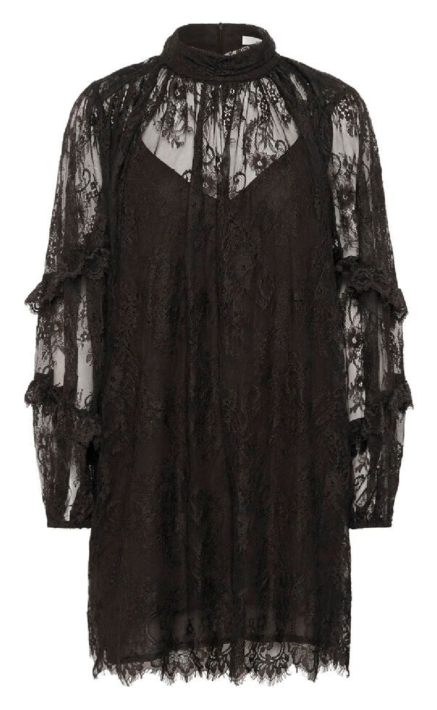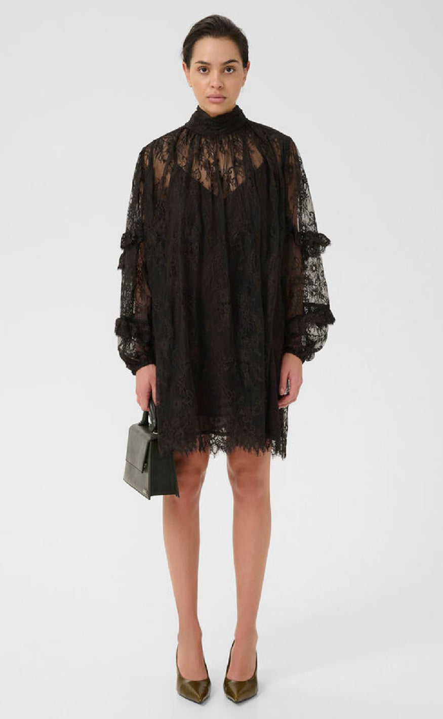 Brun blondekjole fra Gestuz med høj hals, lange ærmer og elegante flæsedetaljer – perfekt til et sofistikeret og feminint look.