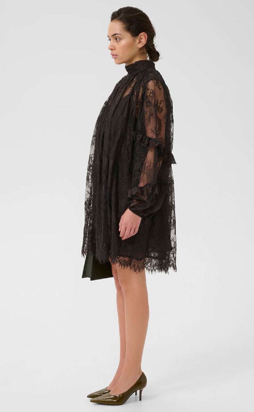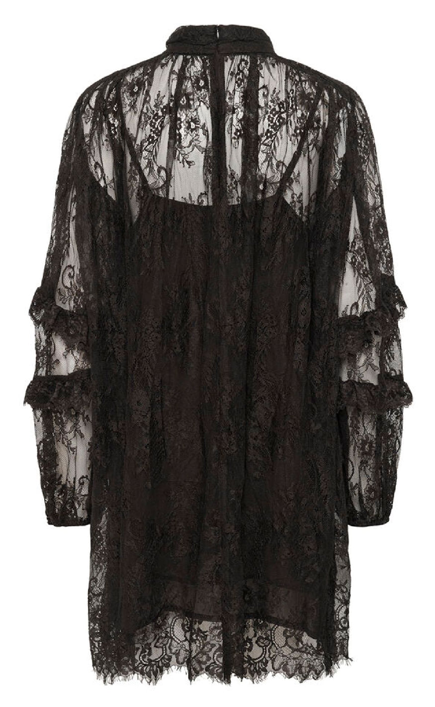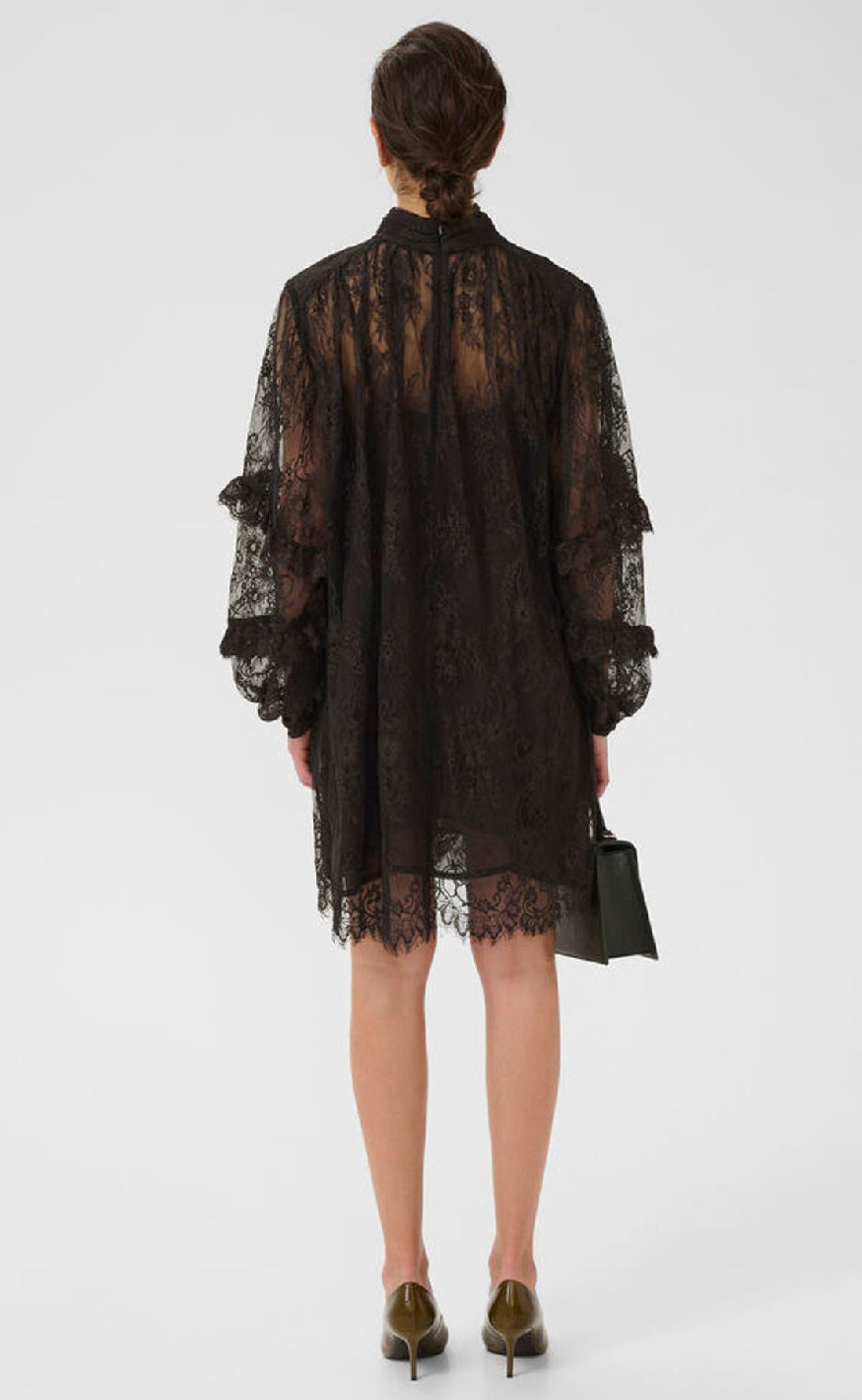 Brun blondekjole fra Gestuz med høj hals, lange ærmer og elegante flæsedetaljer – perfekt til et sofistikeret og feminint look.