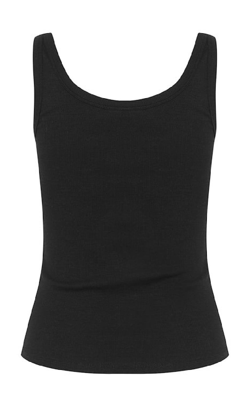 Sort ribstrikket top fra Gestuz med en tætsiddende pasform og rund halsudskæring. Toppen har et enkelt og stilrent design med tone-i-tone logo foran, der giver et diskret og elegant udtryk.