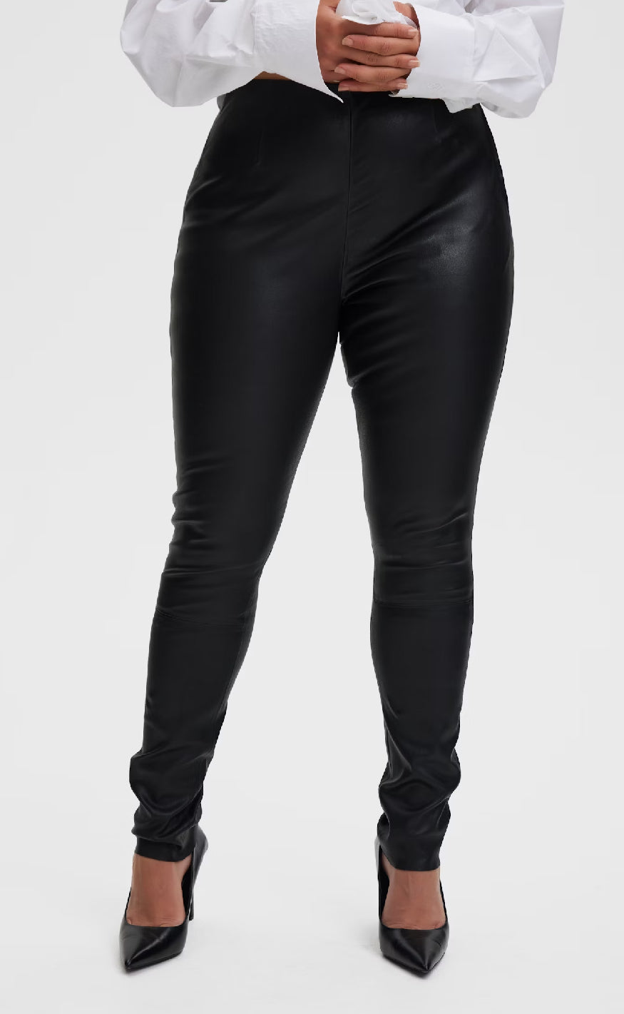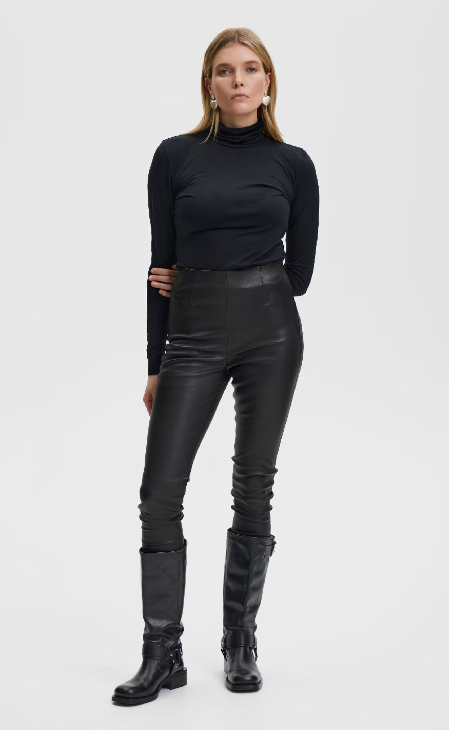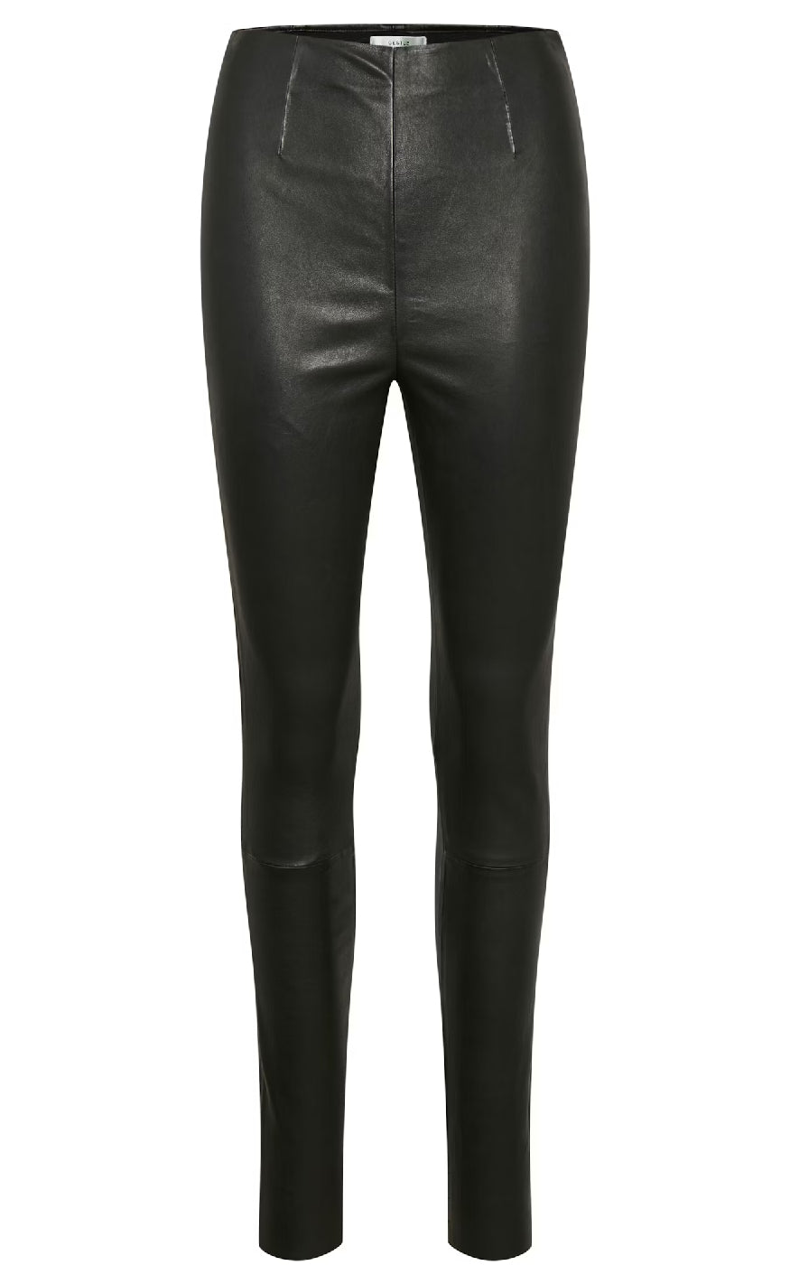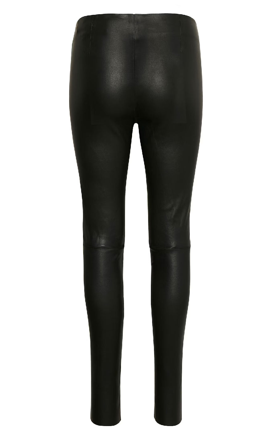 Sorte bukser i imiteret læder fra Gestuz med en tætsiddende pasform og et stilrent, minimalistisk design. Bukserne har en høj talje og et klassisk look, der giver et edgy og moderne udtryk.
