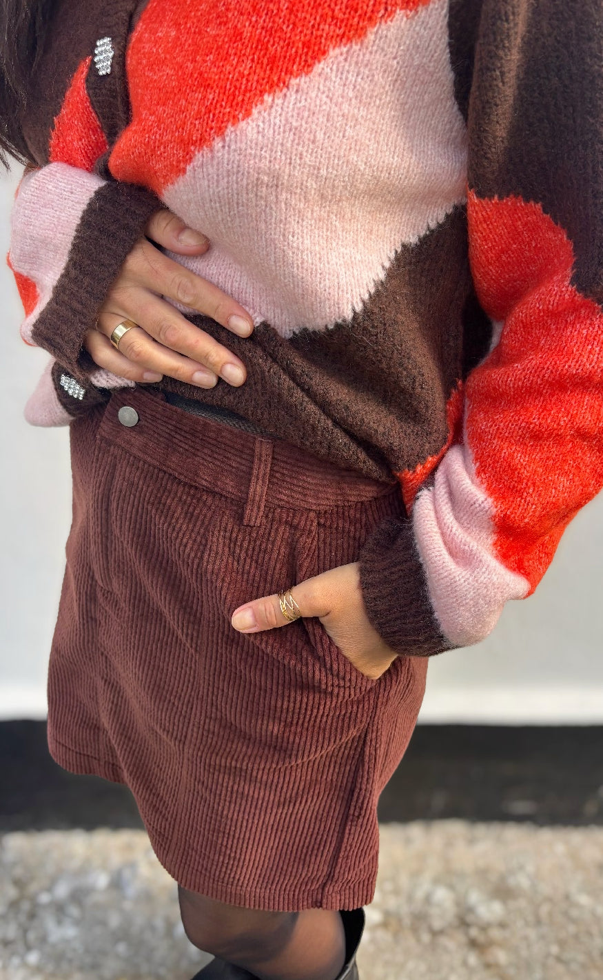 Super fin nederdel i brun. Den korte fløjlsnederdel er designet i en tidløs A-form, som fremhæver en flot silhuet. Med en behagelig taljehøjde og praktiske sidelommer er den både komfortabel og perfekt til hverdagen – nem at style til mange forskellige outfits.