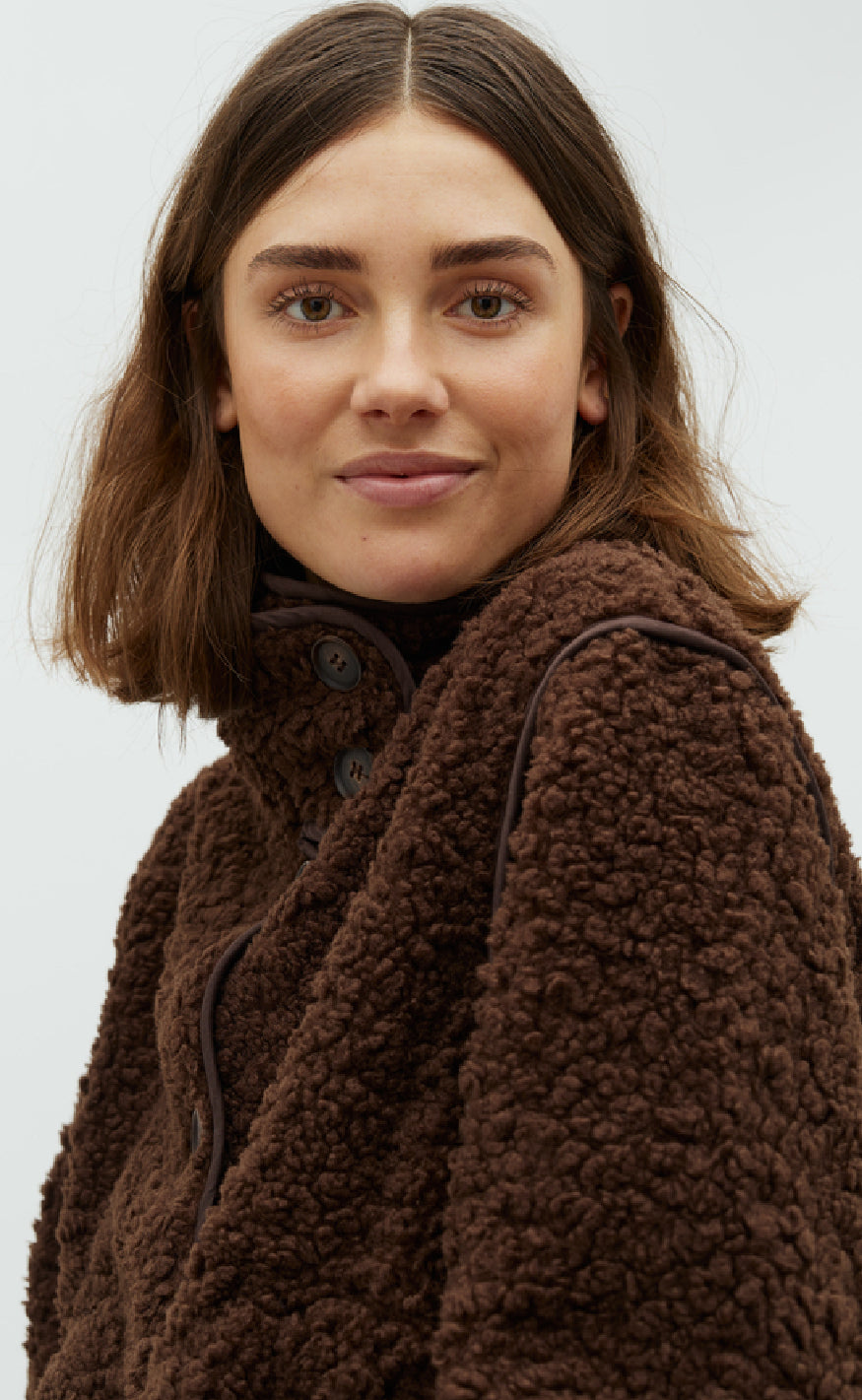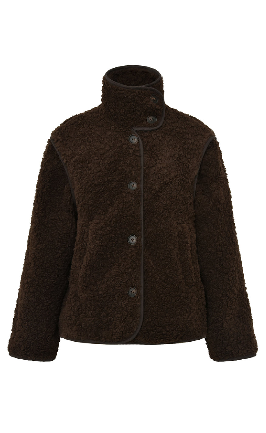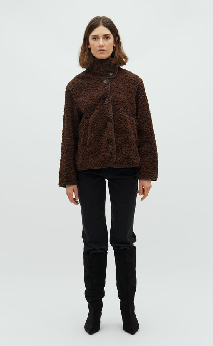 Jakken lukkes med knapper og har en høj hals.