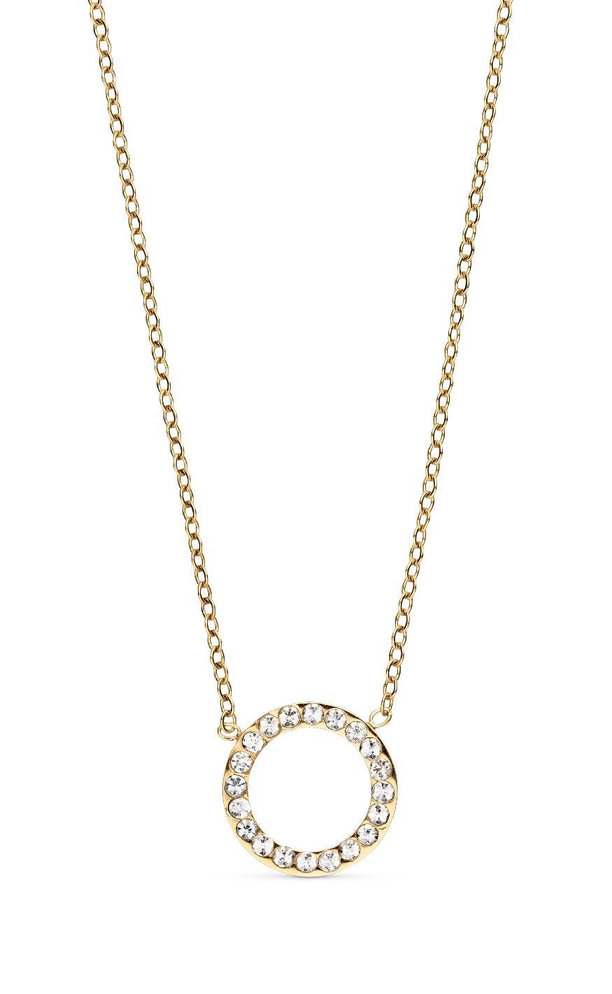 Eksklusiv halskæde fra Smykkeli Copenhagen i guld med et rundt vedhæng med små zirconia sten. Halskæden har et stilrent look, der pifter ethvert outfit op.