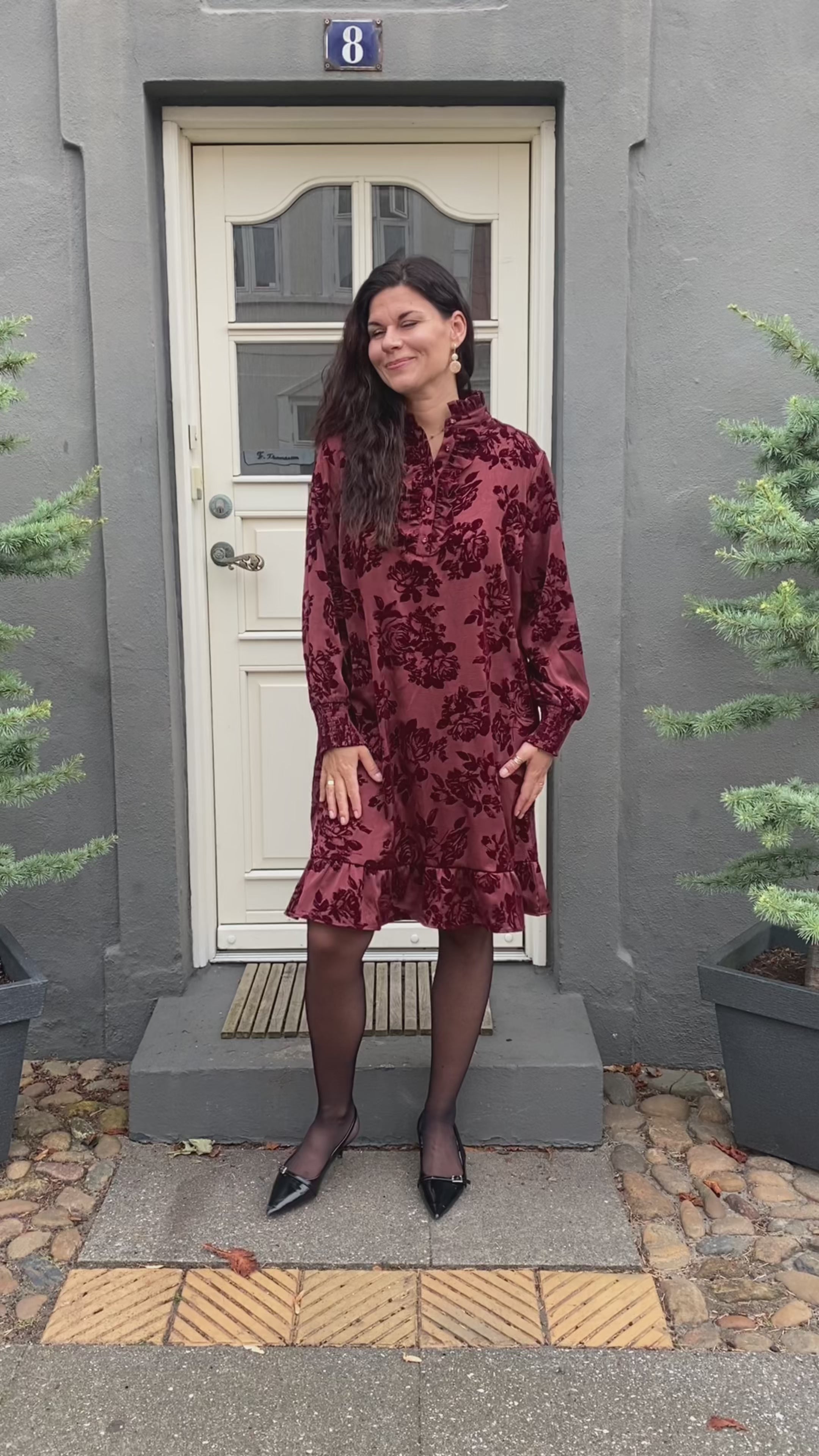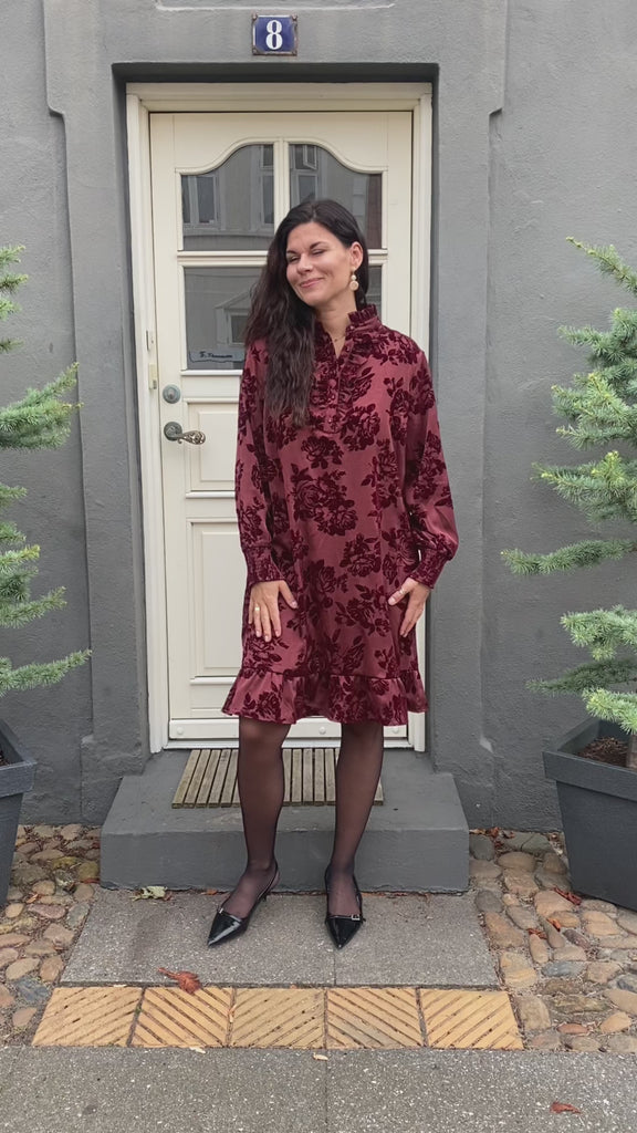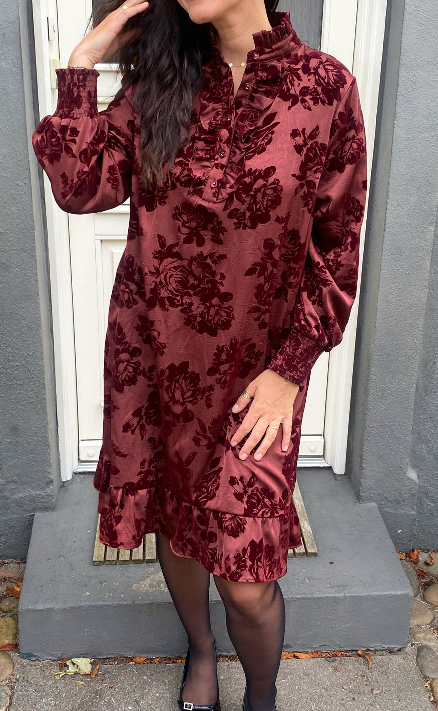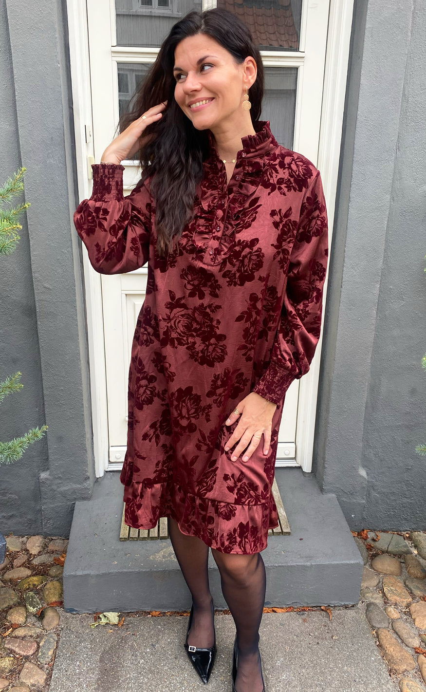 Virkelig smuk og eksklusiv kjole fra Say INA Copenhagen i bordeaux med blomster i velour.