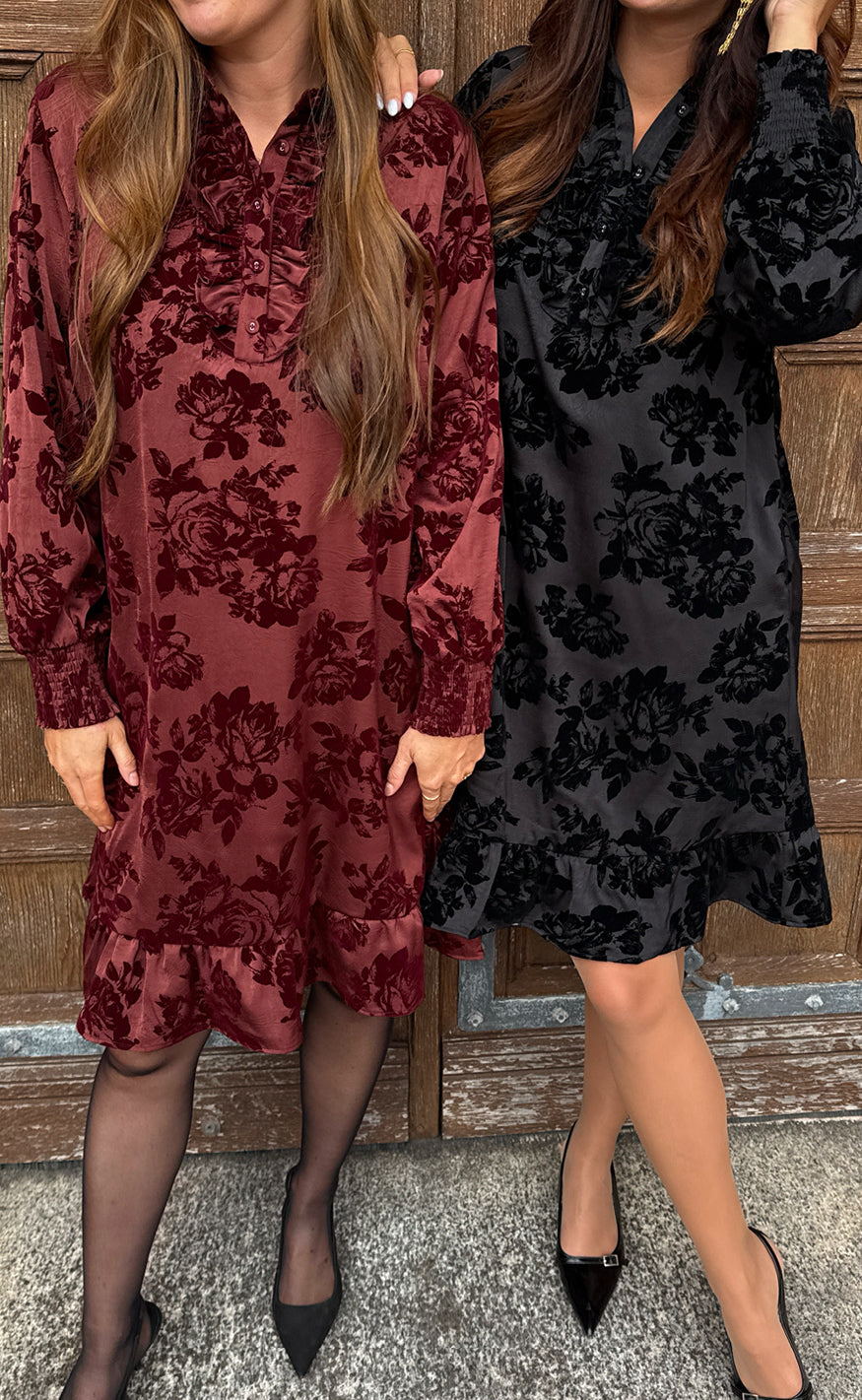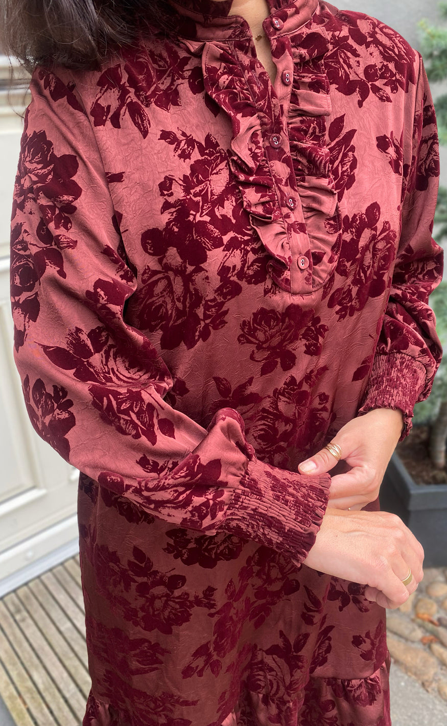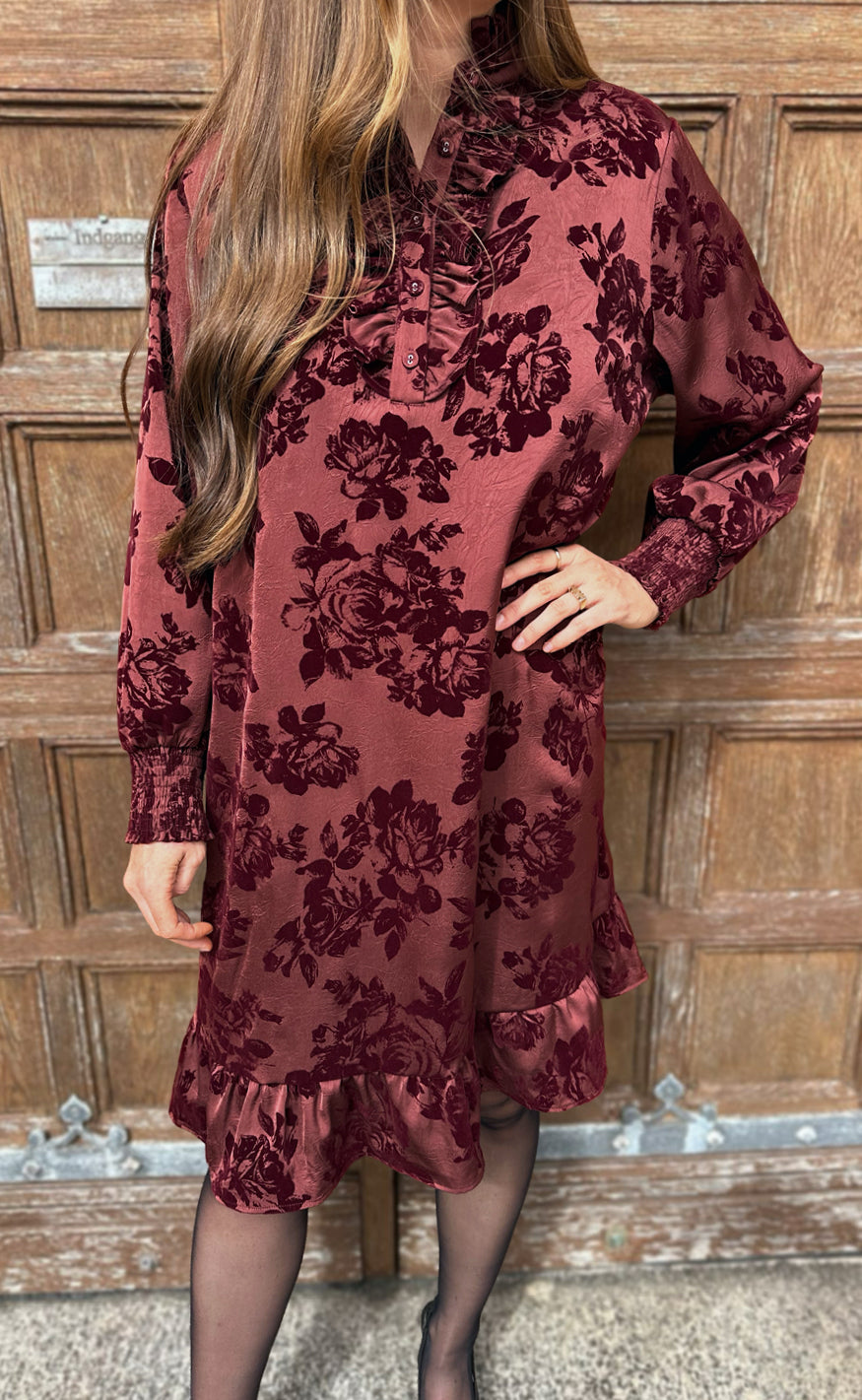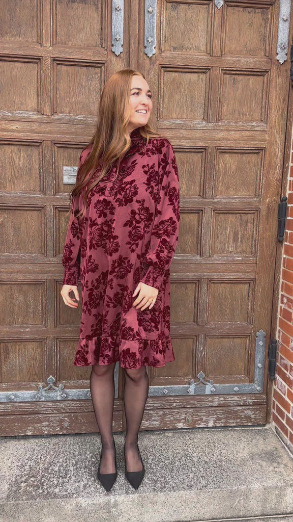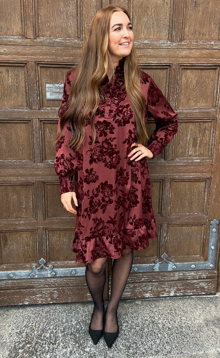 Virkelig smuk og eksklusiv kjole fra Say INA Copenhagen i bordeaux med blomster i velour.