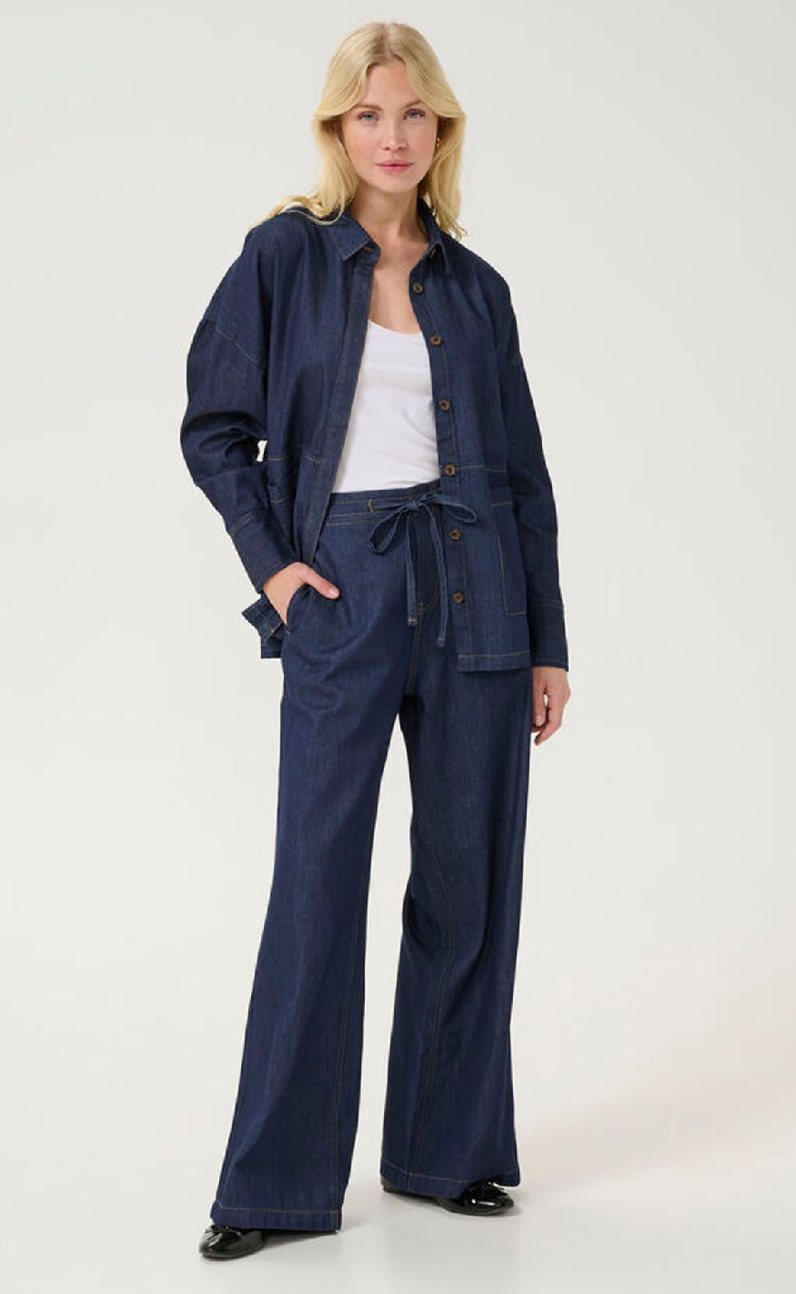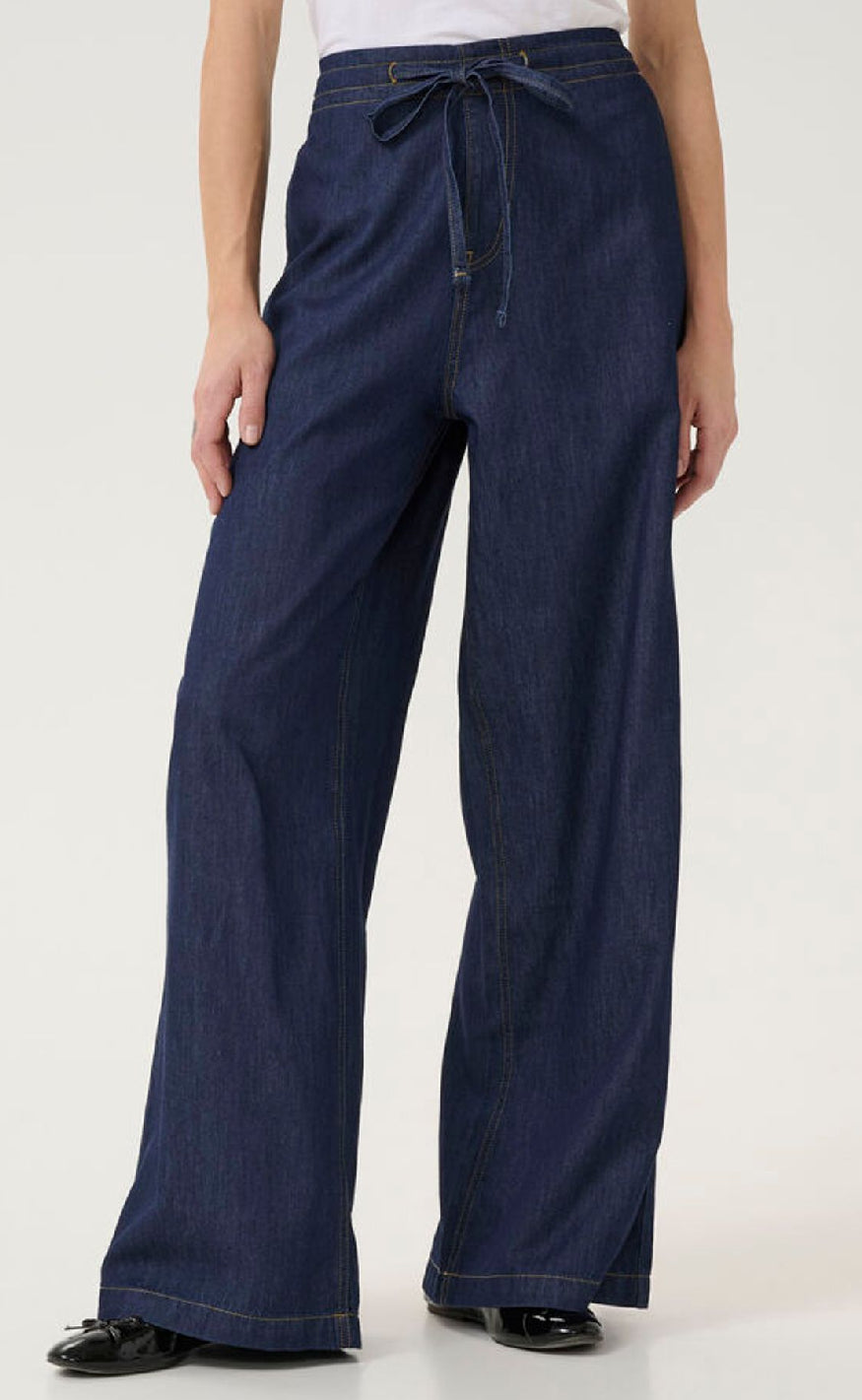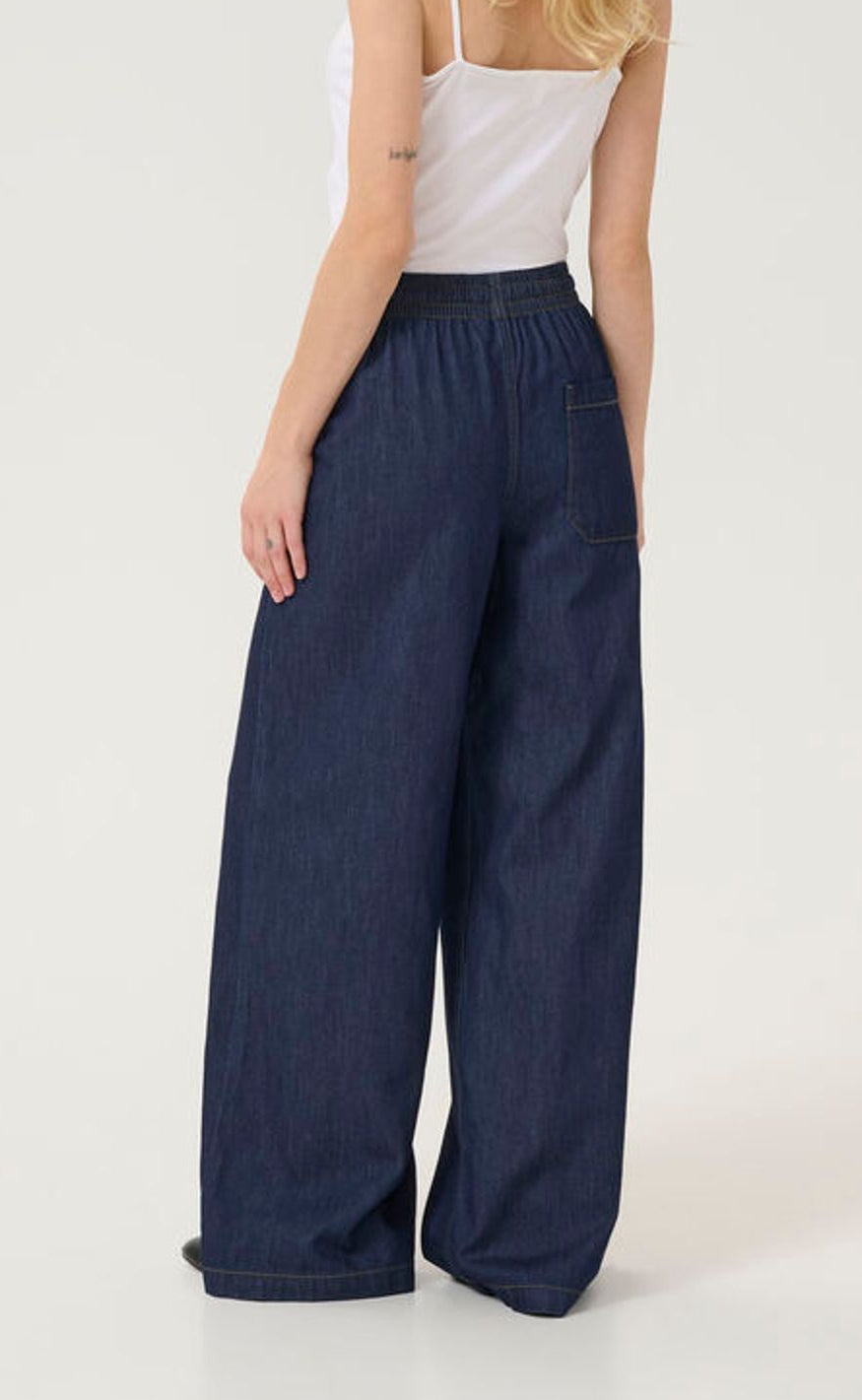 Disse bukser fra Culture kommer i en mørkeblå farve, Bukserne har et dejligt løst fit, med en masse god vidde i benene. Desuden har bukserne bindbånd ved taljen.