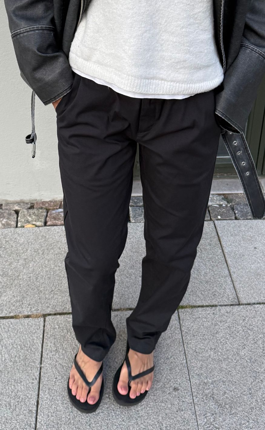 De har elastik i taljen og lukkes med en lynlås. De har et løst fit og er lette i kvaliteten.