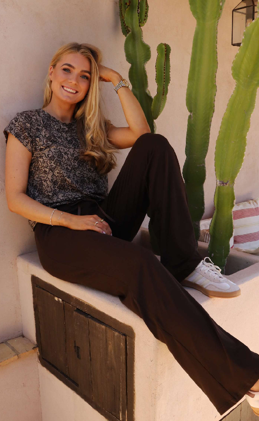 Enkle bukser fra Liberté i en dyb brun farve. Bukserne har en afslappet pasform med lige ben og elastik i taljen for ekstra komfort.
