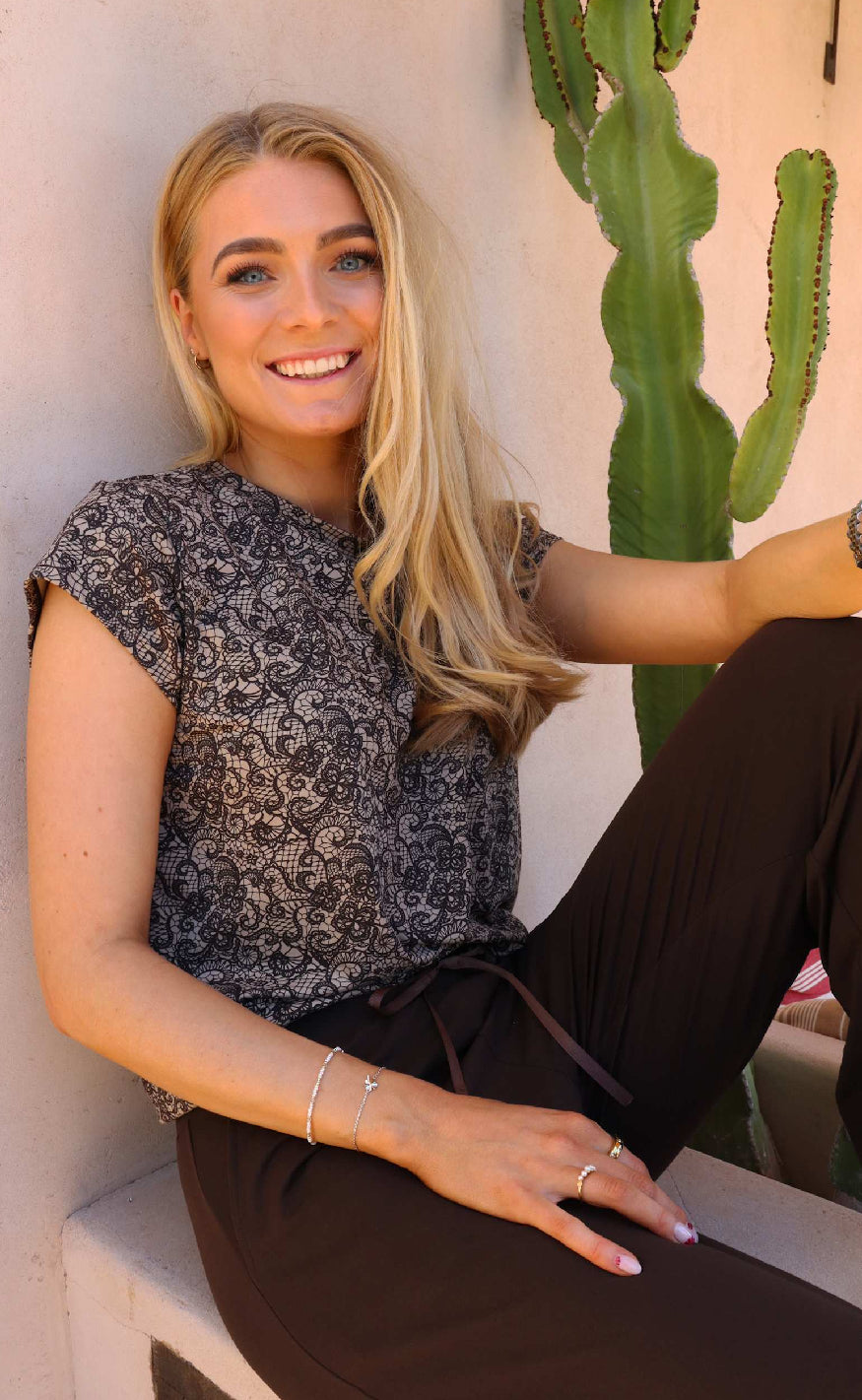 Stoffet har en let, glat struktur, der giver et elegant udtryk, perfekt til både hverdagsbrug og mere stilfulde anledninger.