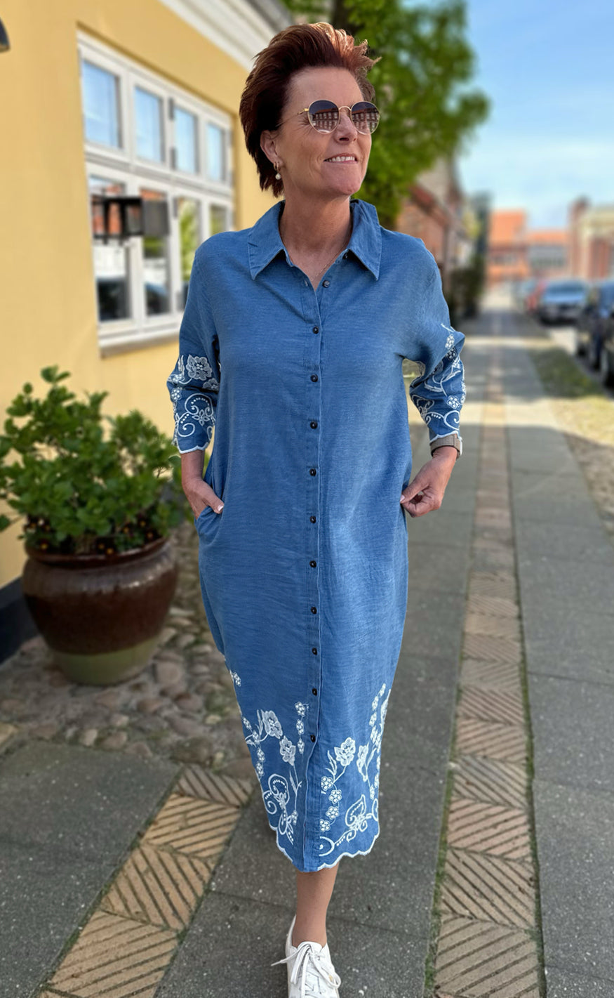 Smuk kjole fra INA Copenhagen i denim blå med hvid broderi på ærmerne og i bunden af kjolen.