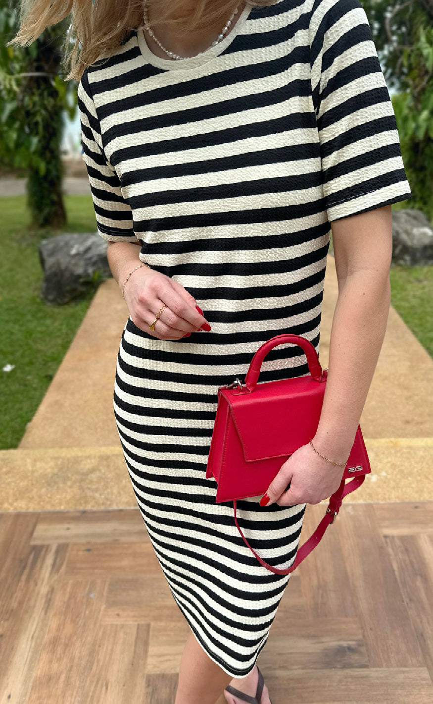Moderne kjole fra INA Copenhagen i et sort og hvid stribet print.