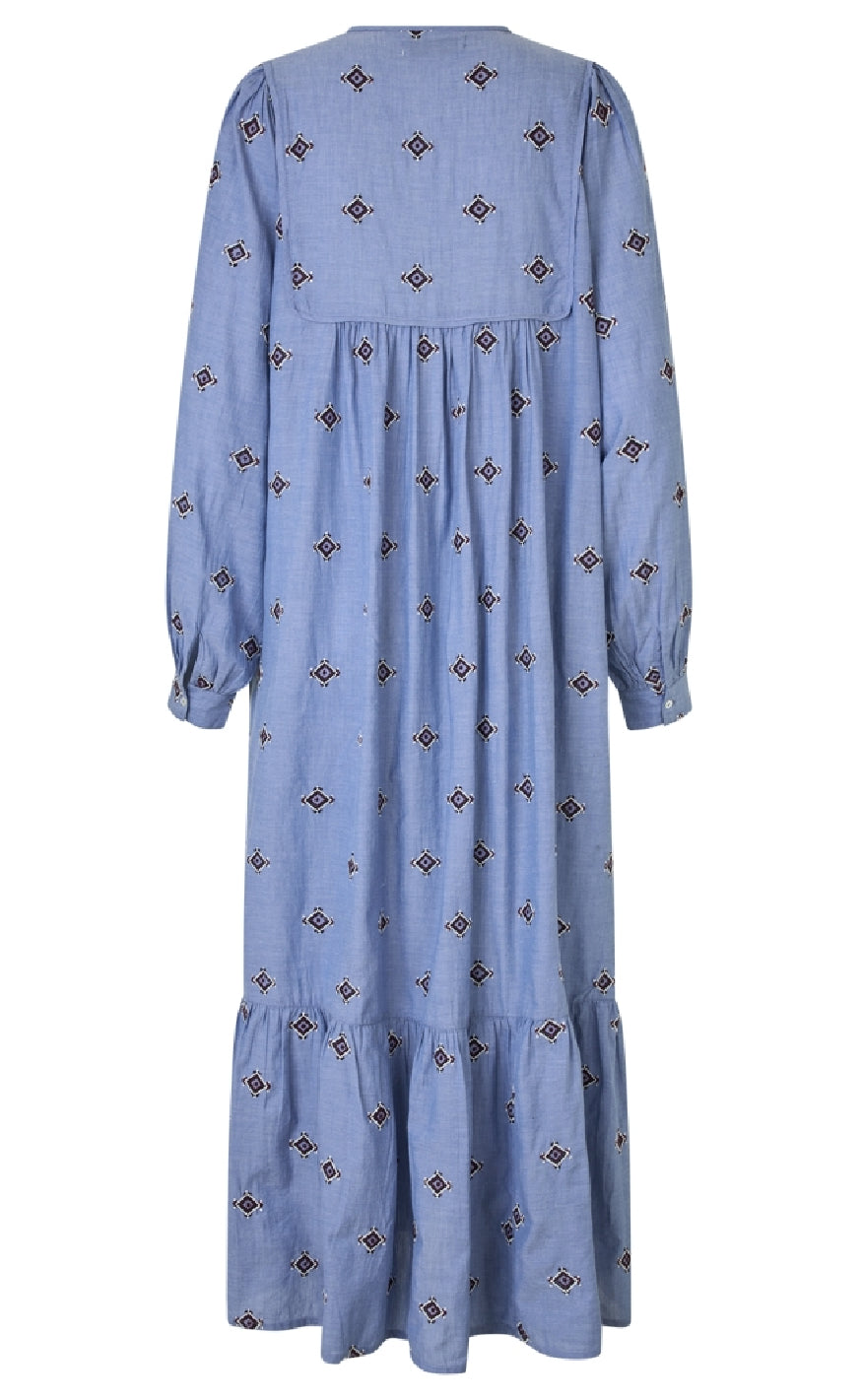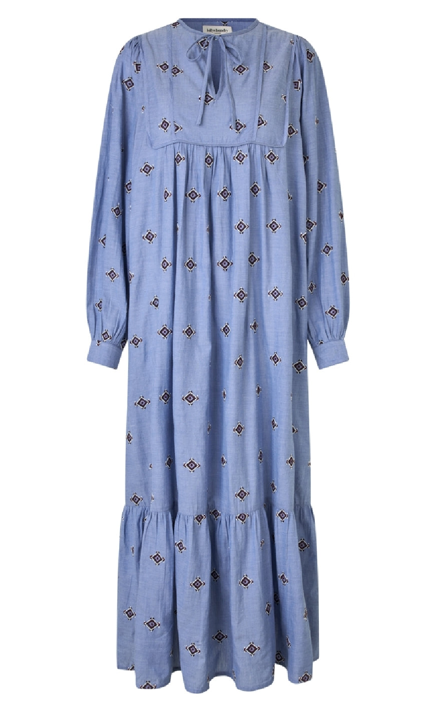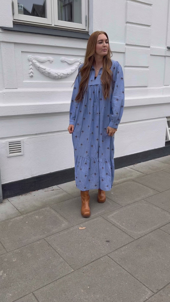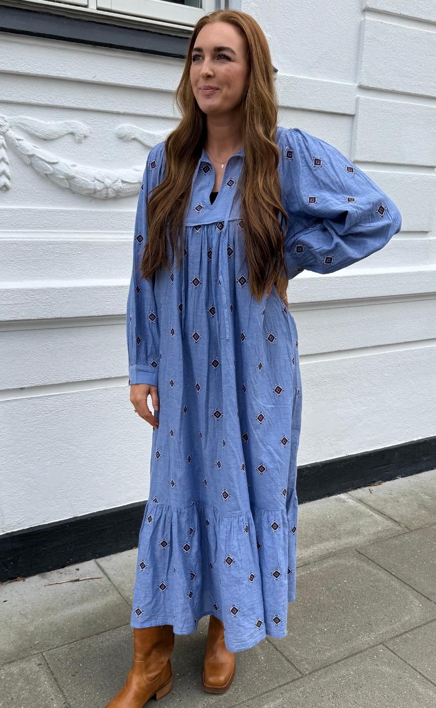 Super smuk maxi kjole fra Lollys Laundry i et blåt print.
