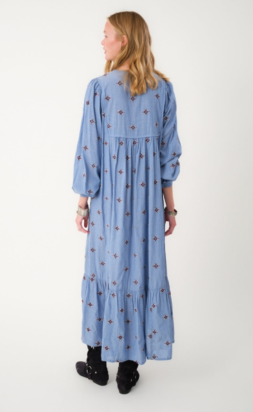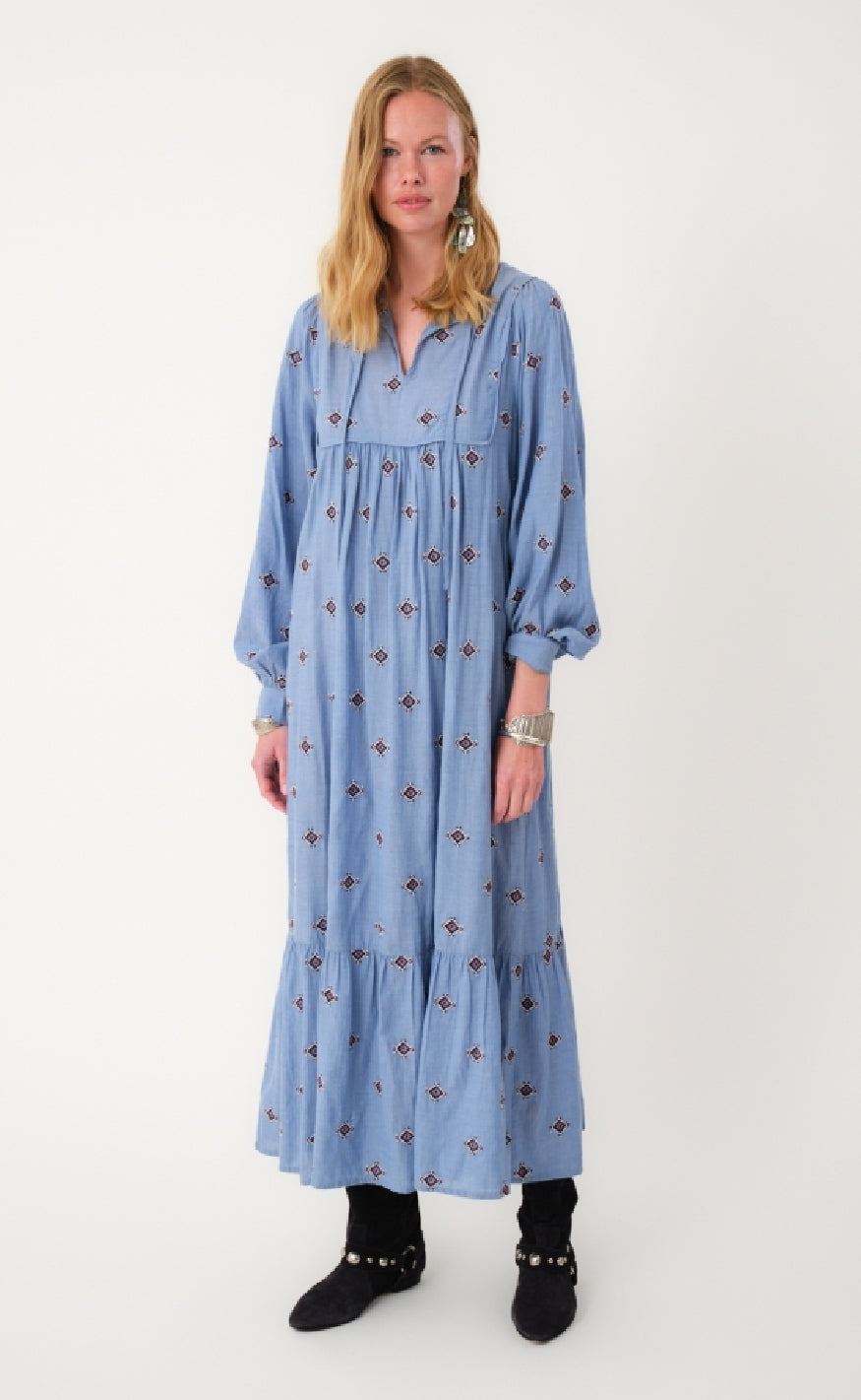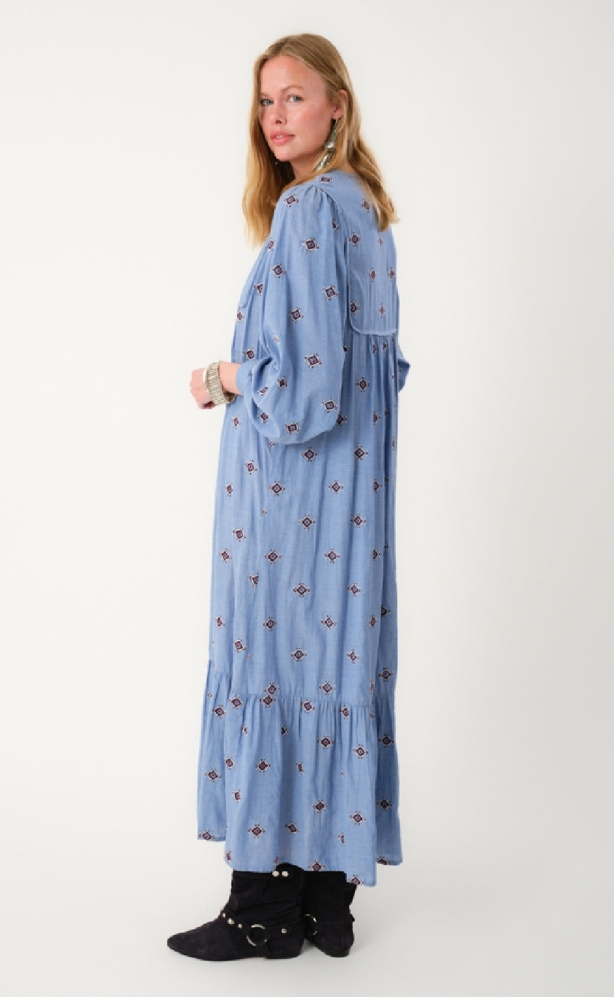 Super smuk maxi kjole fra Lollys Laundry i et blåt print.