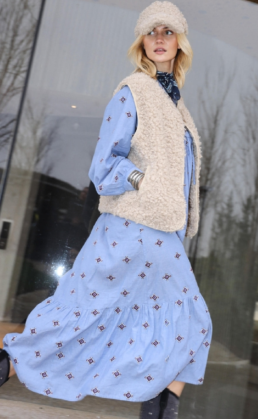 Kjolen har lange ærmer, overskæringer samt en bindedetalje ved halsen.