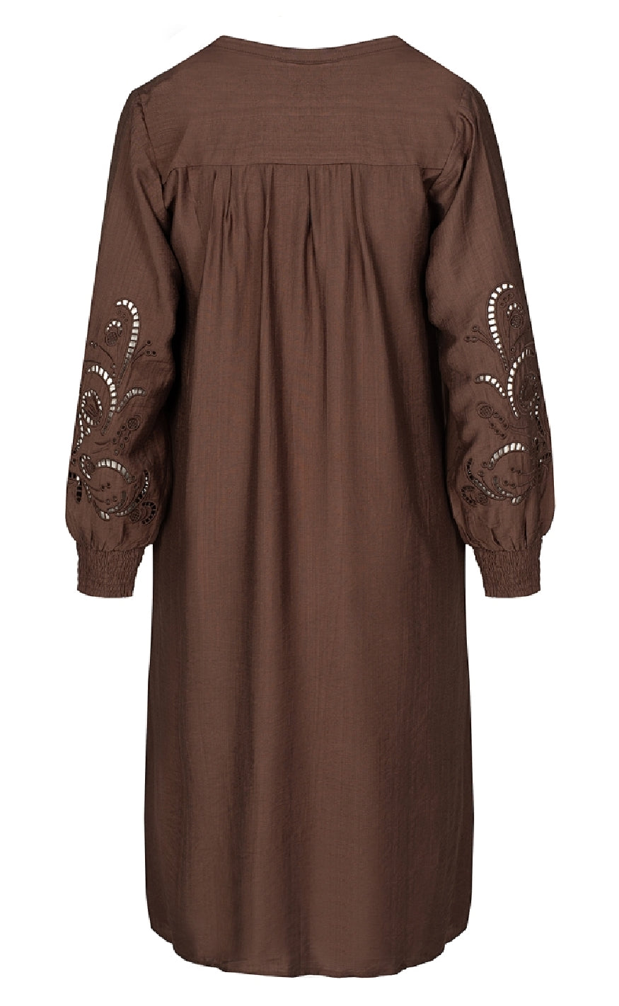 Kjolen har lange ærmer med broderidetaljer og smock ved manchetterne.