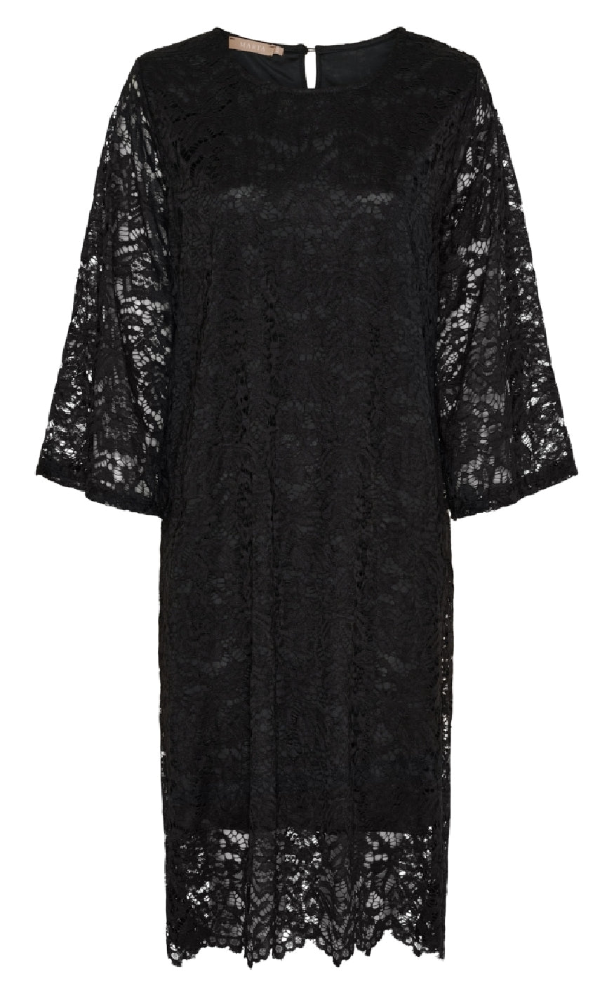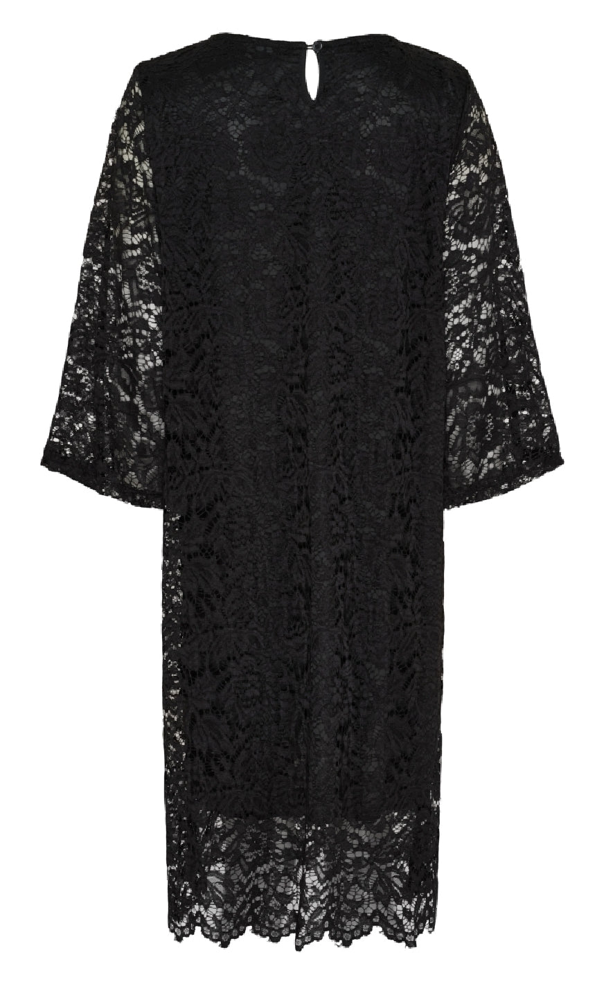 Elegant sort blondekjole med 3/4-ærmer og rund halsudskæring – perfekt til både festlige lejligheder og aftenbrug. Let og komfortabel pasform med smukke detaljer i blonden.
