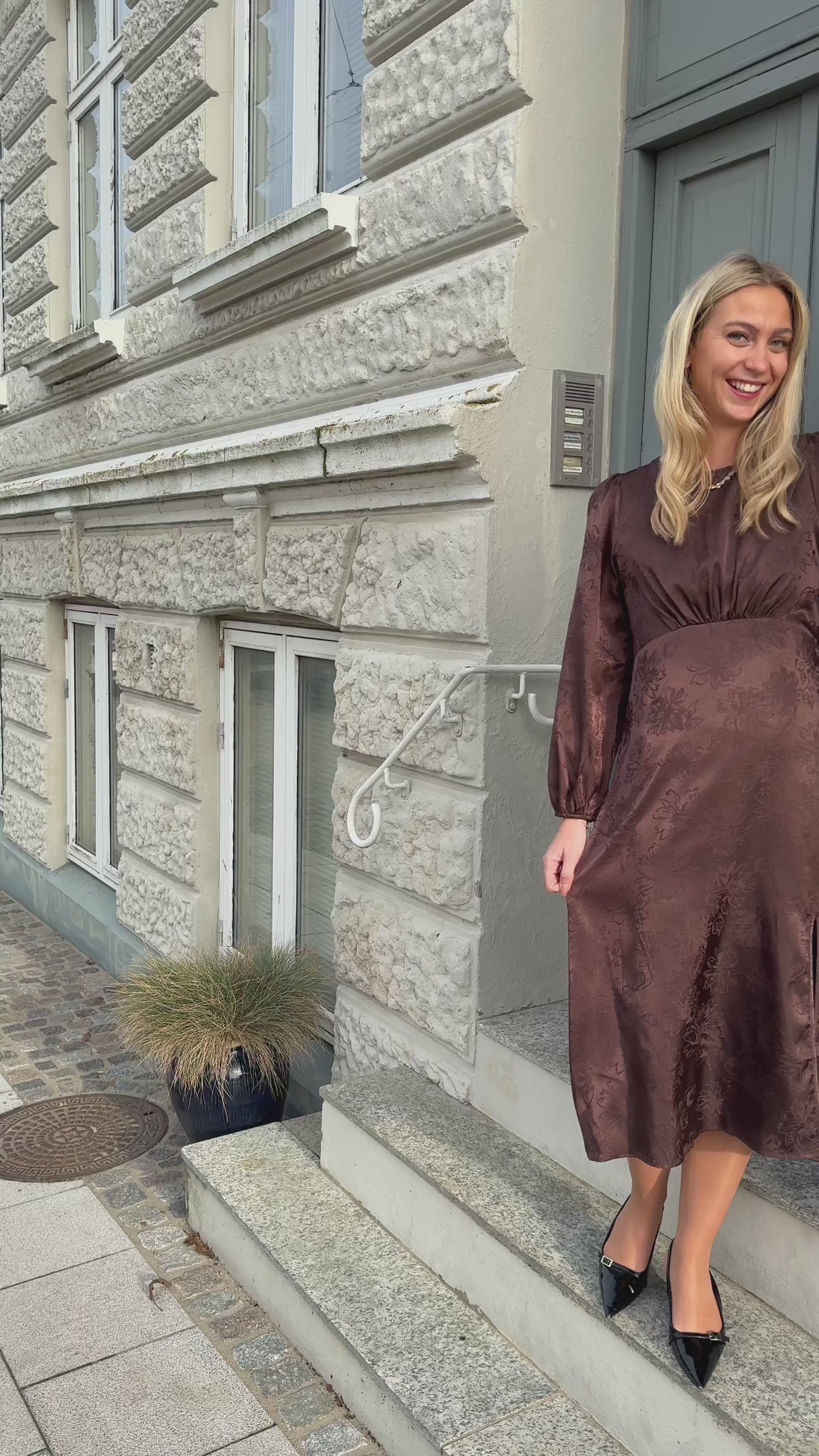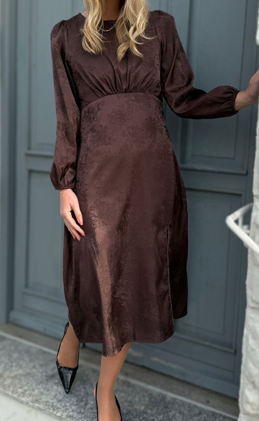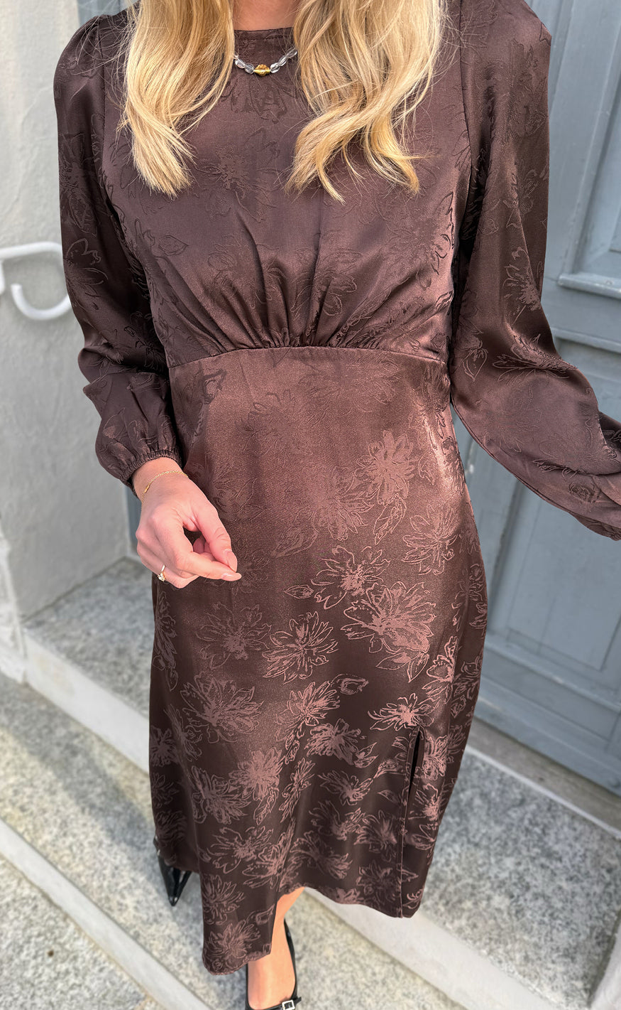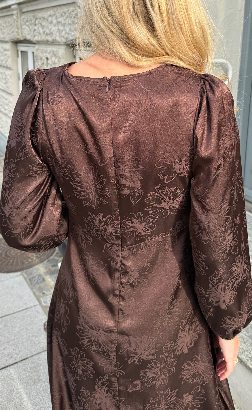 Eksklusiv kjole fra Say INA Copenhagen i mørkebrun med de fineste blomster i stoffet.