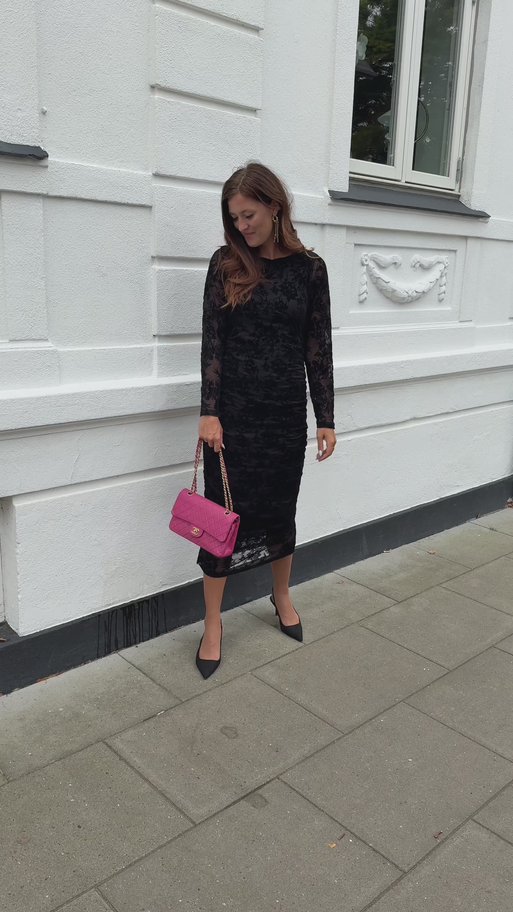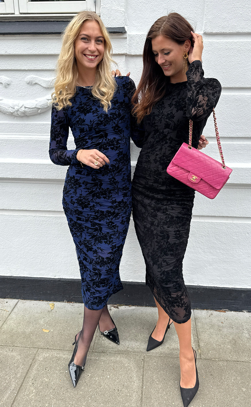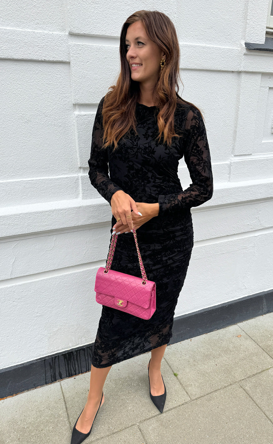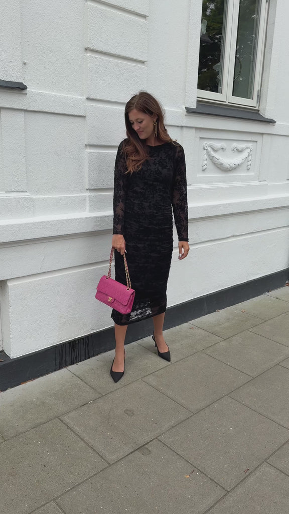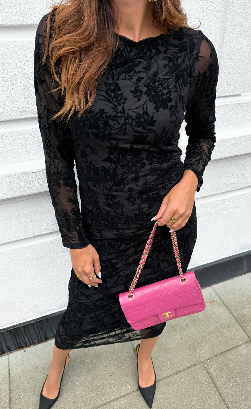 Den smukkeste mesh kjole fra INA Copenhagen i sort med sorte blomster i velour.